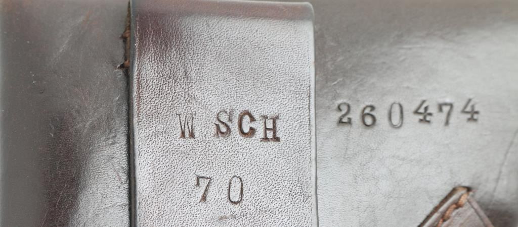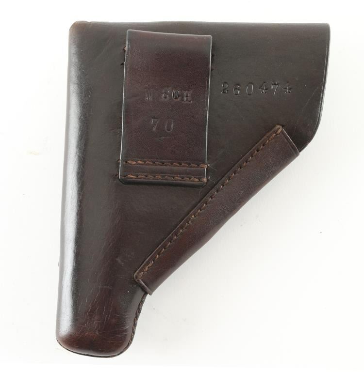Post war Walther brown leather flap PPK Holster. "PPK" ink stamped inside of flap. Loop stamped "W SCH 70". and back of holster stamped "260474". Appears to be a Cold War era, Military or Police issued holster. Very good condition.