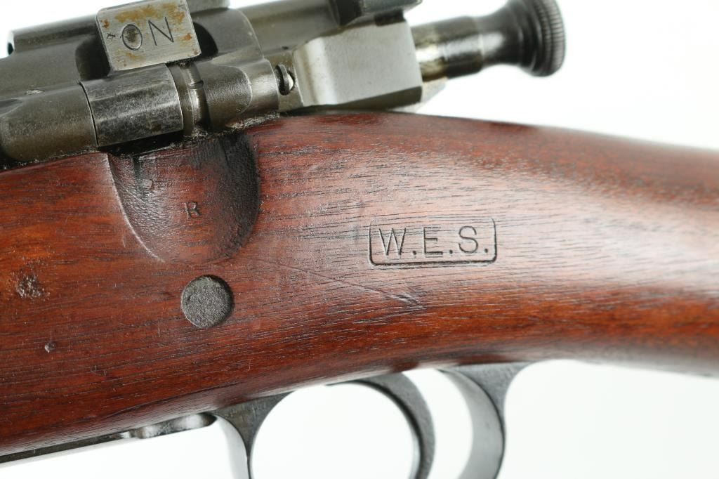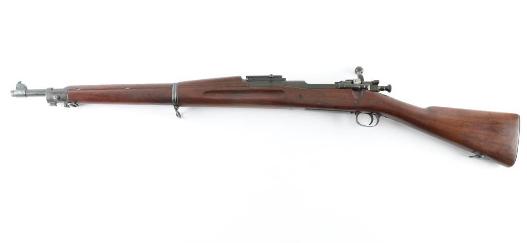 Rebuilt U.S. Military bolt action service rifle chambered in .30-06 Springfield,. Features a parkerized finish, 24" barrel marked "SA(flaming bomb) 5-21", blade front sight, adjustable rear sight graduated to 2,700 yards, integral five round box magazine with cut-off switch, bent bolt handle, safety switch on bolt, smooth trigger, 03-A3 bottom metal/triggerguard, two barrel bands with a bayonet lug on the front band, sling swivels, checkered metal trapdoor buttplate, full-length smooth walnut handguard and straight shoulder stock with "P" proof, "WES" in box, and "O180" on right buttstock.. Rifle retains approximately 85% of it's arsenal refinish with minor edge wear, and scratches/loss to the sight protector. Action is smooth, bore is very good/bright, and wood stocks are very good. NRA Condition-Very Good. C&R firearm