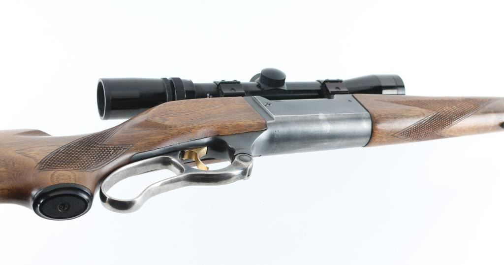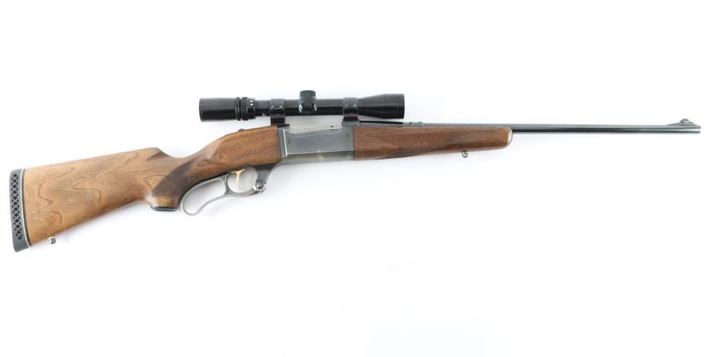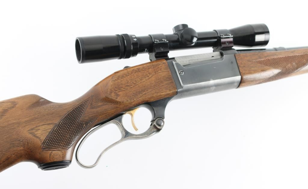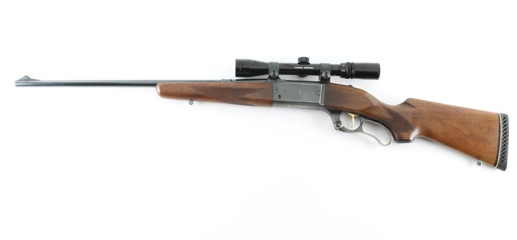 Lever action rifle manufactured circa 1961. Barrel marked with Chicopee Falls address. Features blued finish, case color finger lever, gold accent serrated trigger, two piece wood stock with curved grip, checkered panels at wrist & forend, ventilated rubber recoil pad, 22" barrel, sling studs, blade front sight, no rear sight (empty dovetail in barrel), fixed rotary magazine with brass cartridge counter, tang safety also locks lever, cocking indicator. Bore is very good condition. Retains 75% blue, thinning & showing bare metal on all edges and across bottom of receiver, with scratches and scuffs. Bolt has bright jeweled surface. Finger lever retains golden and some blue hues to the case color on sides, mostly silver on bottom edge. Wood is very good with dents & scratches. Condition is NRA Very Good+ *** C&R Firearm ***