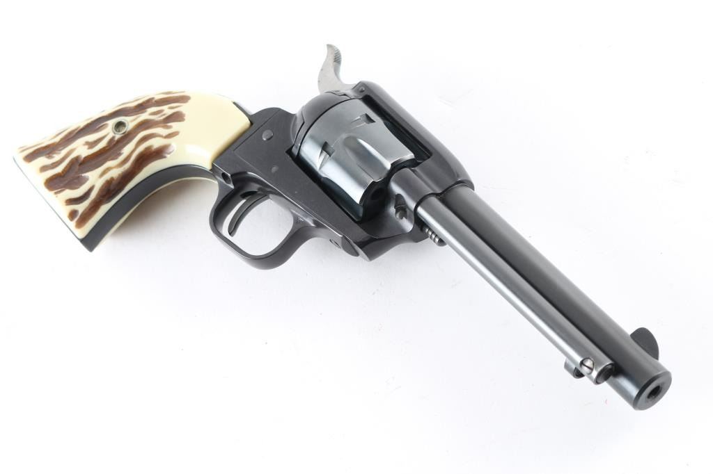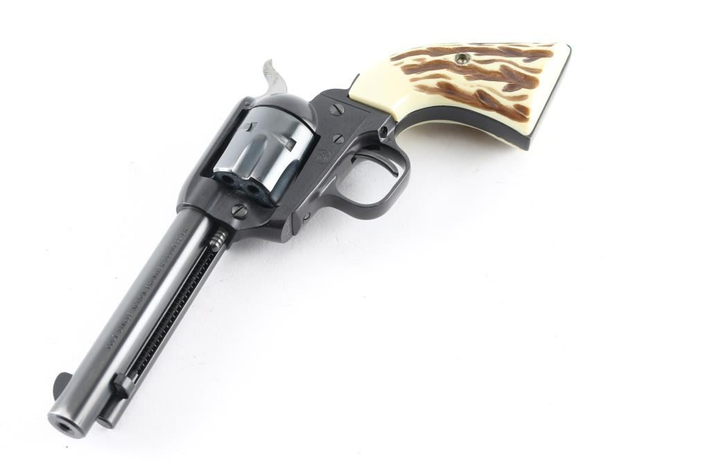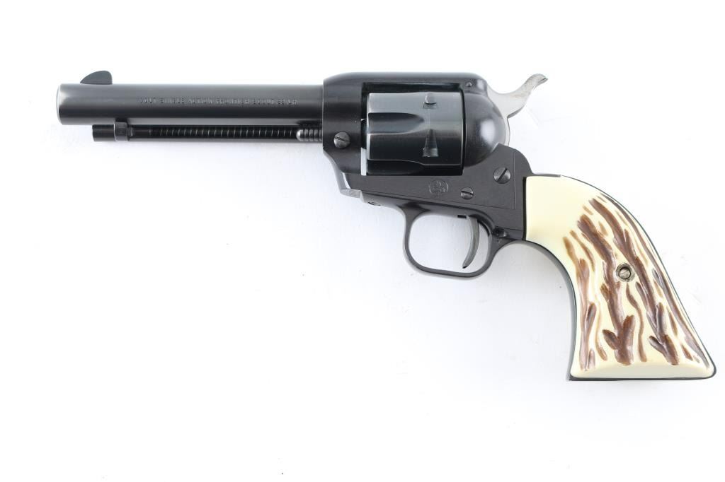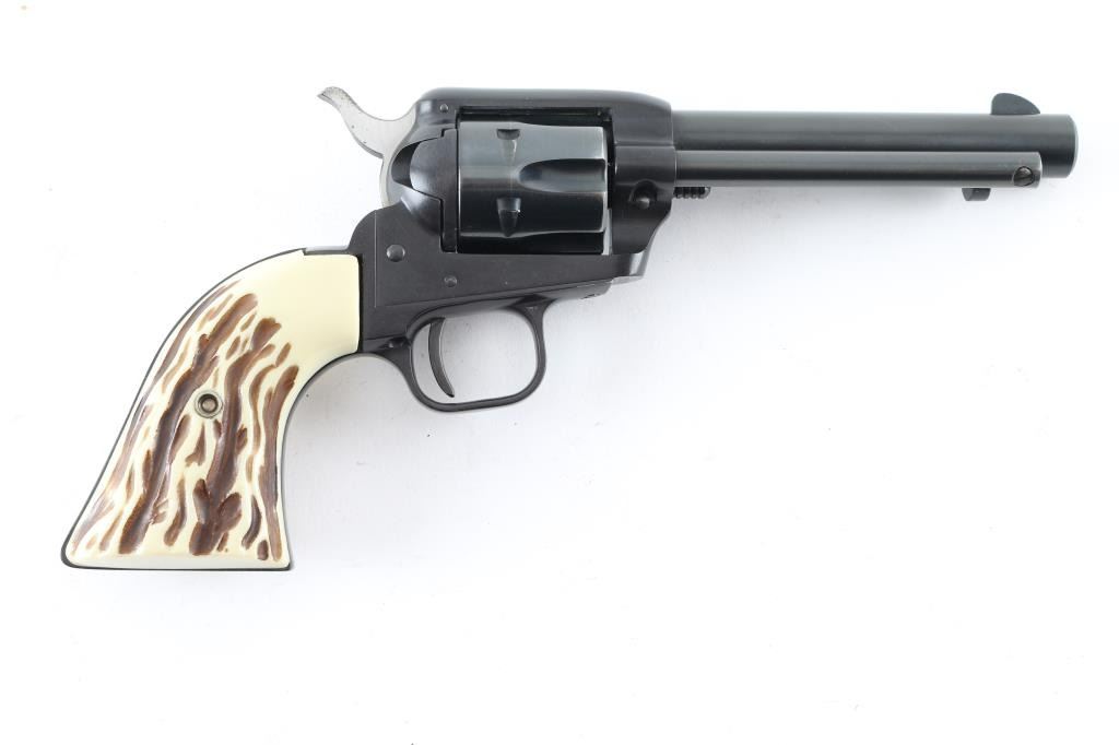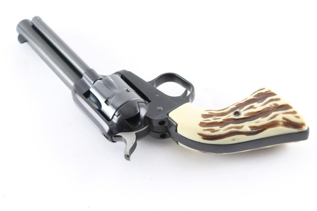Western style single action rimfire revolver manufactured circa 1960. Scaled down copy of a Colt Single Action Army. Features blued finish, off-white plastic faux stag grips, 4.75" barrel, fixed sights, 6 shot fluted cylinder. Bore and charge holes are very good condition. Retains 90% blue with muzzle wear, edge losses, handling marks. Grips are very good condition. Includes factory two piece "wood grain" cardboard box with paperwork, good condition Hunter leather belt holster. Condition is near NRA Excellent *** Modern Firearm ***