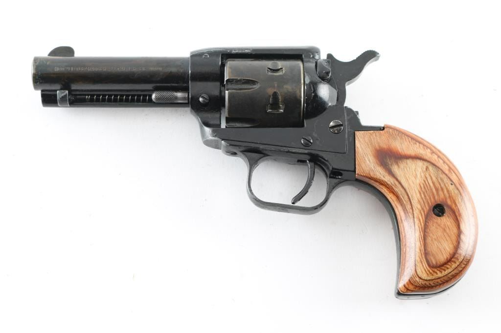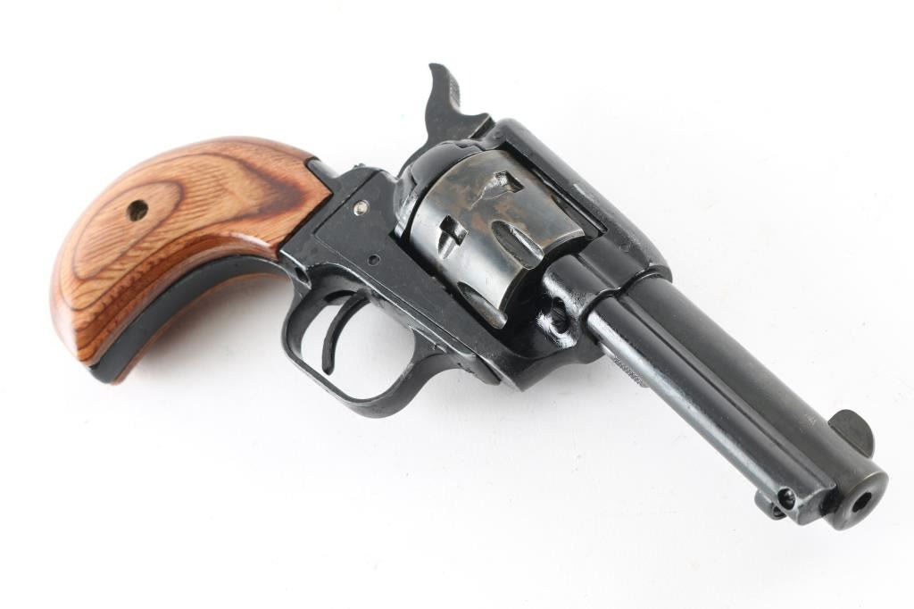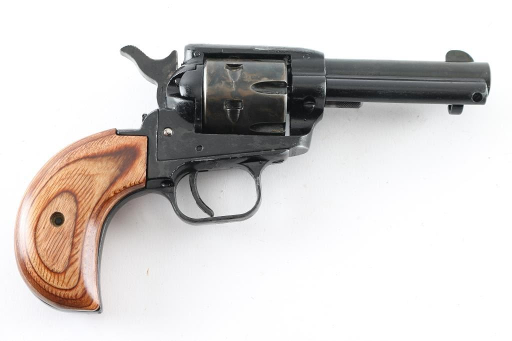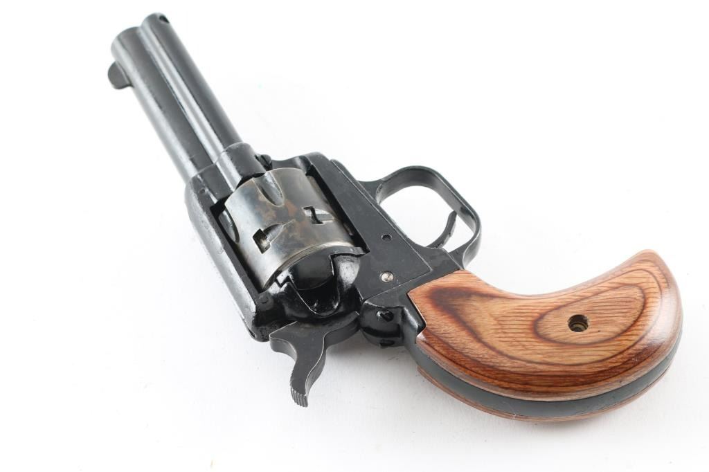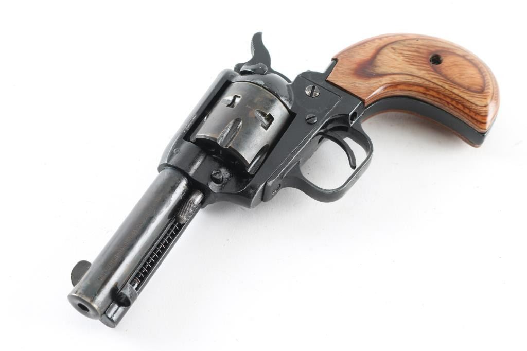 Single action, rimfire revolver chambered for 22LR ammunition. Features a 3.5" barrel, bird's head grip frame with wood grips, manual safety, 6 shot cylinder with side loading gate. It has a fixed blade front sight, integral rear sight, thin smooth trigger and serrated hammer spur. The metal finish looks terrible. It's hard to tell what it looked like originally but it has been painted black and not done well. The paint is flaking off and the "over spray" is bad. It seems to function fine and the grips are great (best looking part of the gun). If stripped and reblued it would look fine. Bore looks great, bright. Comes with owners manual and a soft side case. Condition is NRA Good (just looks bad) *Modern Firearm*
