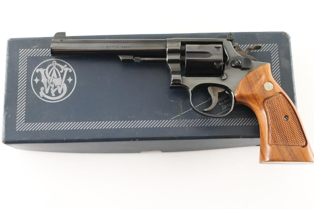 'The K-38 Target Masterpiece' Medium frame double action revolver chambered in .38 Special, manufactured circa 1977. Features a blued finish, pinned 6" barrel with serrated sighting rib, raised patridge front sight, adjustable micrometer click rear sight, fluted six-shot cylinder, non-shrouded ejector rod, serrated .500" trigger, .500" checkered spur target hammer, three screw square butt K target frame with ten groove back strap, and two-piece checkered walnut target grips with S&W medallions. Bore is excellent. Retains 98% finish with minor handling marks, thin cylinder drag line. Grips are excellent condition. Action is smooth with tight lock-up. Includes a factory two piece blue cardboard box with documents, parchment paper, factory cleaning kit. Condition is NRA Excellent *** Modern Firearm ***