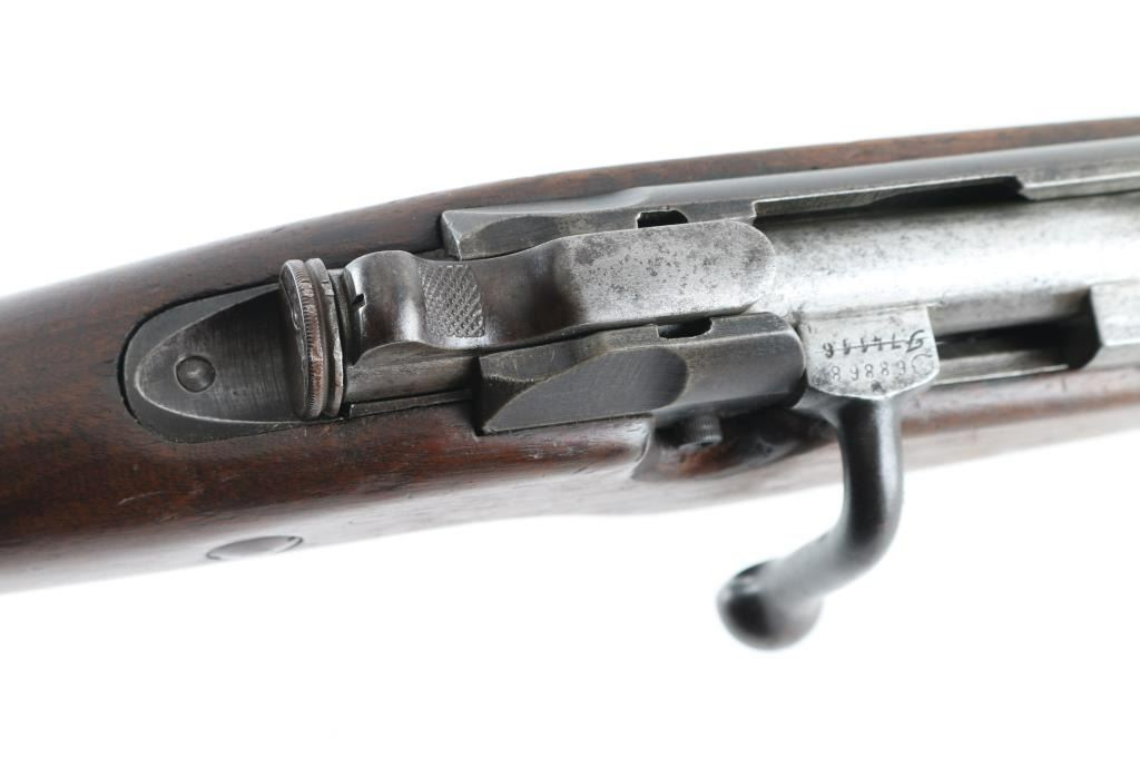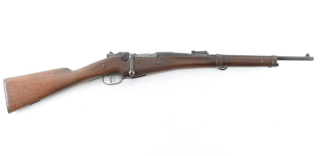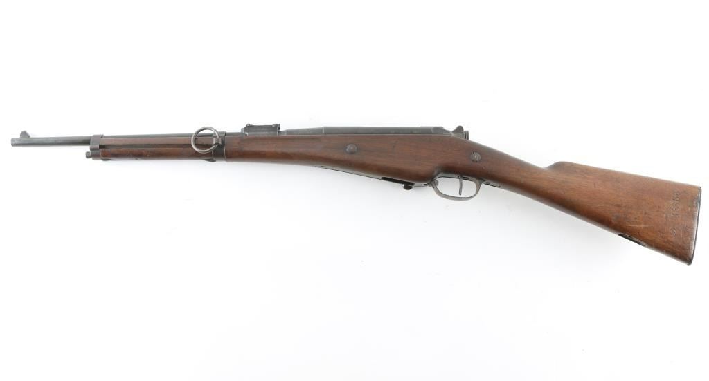 WW1 French made (Chatellerault Arsenal) Berthier bolt action military carbine with a 17.75" barrel, bayonet lug, sling attachments, tangent rear sight and matching serial numbers between receiver, barrel, floorplate,bolt, and stock. Dated 1917. Metal finish is grey on the bolt, butt plate, and triggerguard. The bluing on the other parts has dulled. The rear sling swivel is missing as is the cleaning rod. Bore is rough but rifling present.. The wood is good with some minor ding/scratches with a faint cartouche. NRA Condition-Good. C&R firearm.