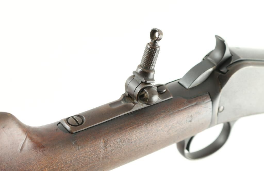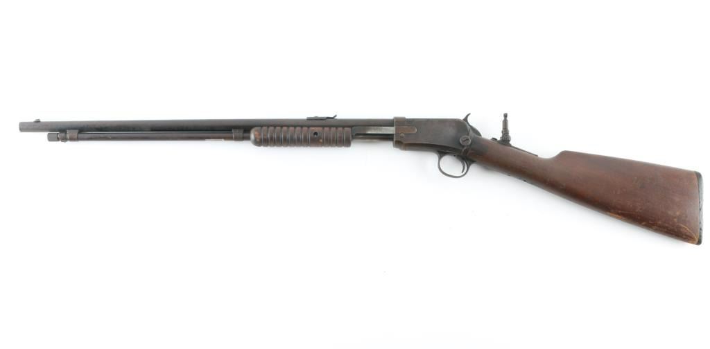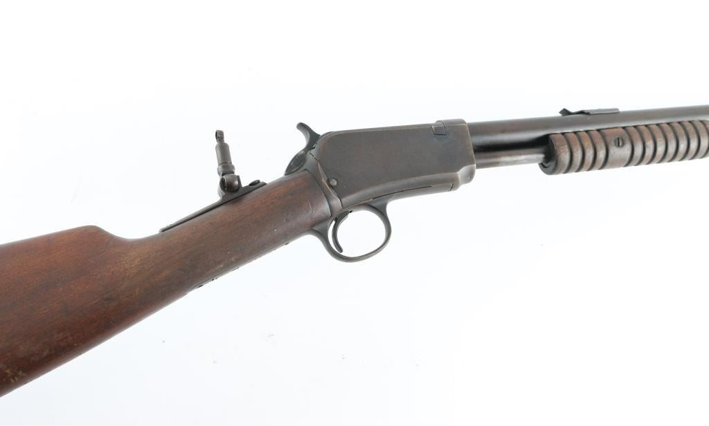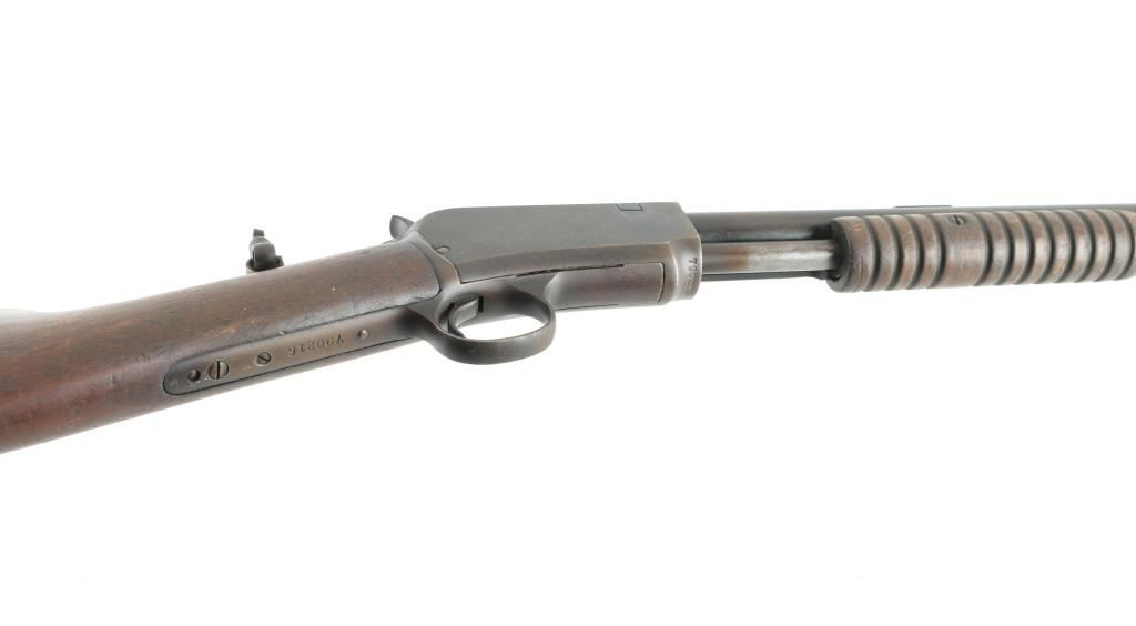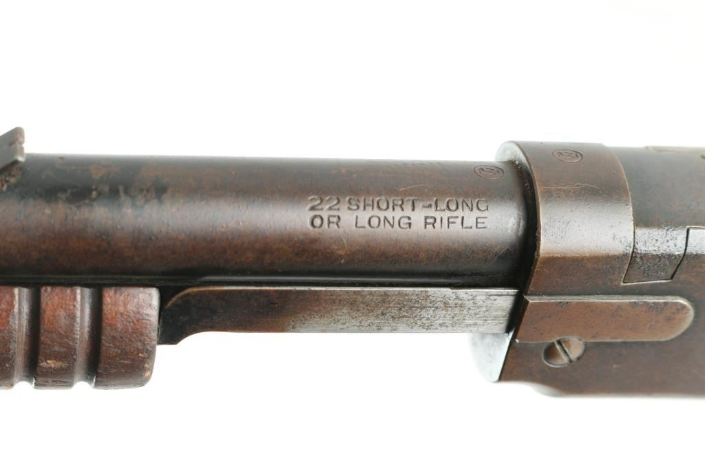 Vintage take-down slide action repeating rifle chambered for .22 Short, Long or Long Rifle, manufactured 1906-1932. Features a blued refinish, 20" round barrel, near full-length 11 round magazine tube, dovetailed blade front sight, elevation adjustable rear sporting sight, smooth trigger, knurled hammer spur, take-down steel receiver, grooved wood slide handle, and smooth walnut straight grip shoulder stock with hard rubber Winchester buttplate. Tang mounted peep sight. Matching serial numbers are found on the receiver and lower tang. Rifle retains approximately 10% of its blued finish, mostly turning a brown patina with scattered surface rust, and some pin-prick pitting. traces of blue in recessed areas. Action is sound, the bore is very good and the wood stocks are fair with scratches/dings, and some chips. Bore is Good. Could use some TLC. NRA condition-Fair C&R firearm.