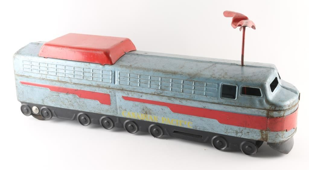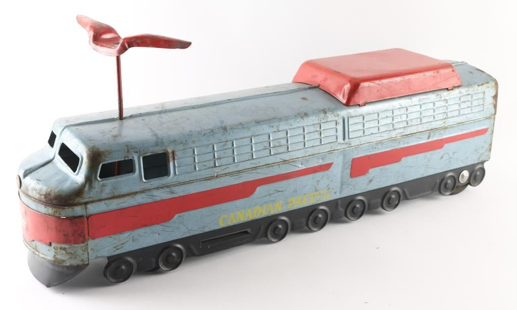 Blue and red painted metal with original logo on both side. Good condition usual dings and losses for its age,