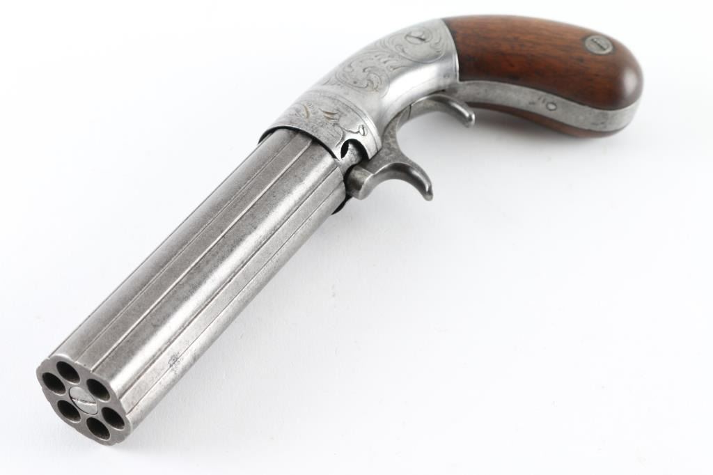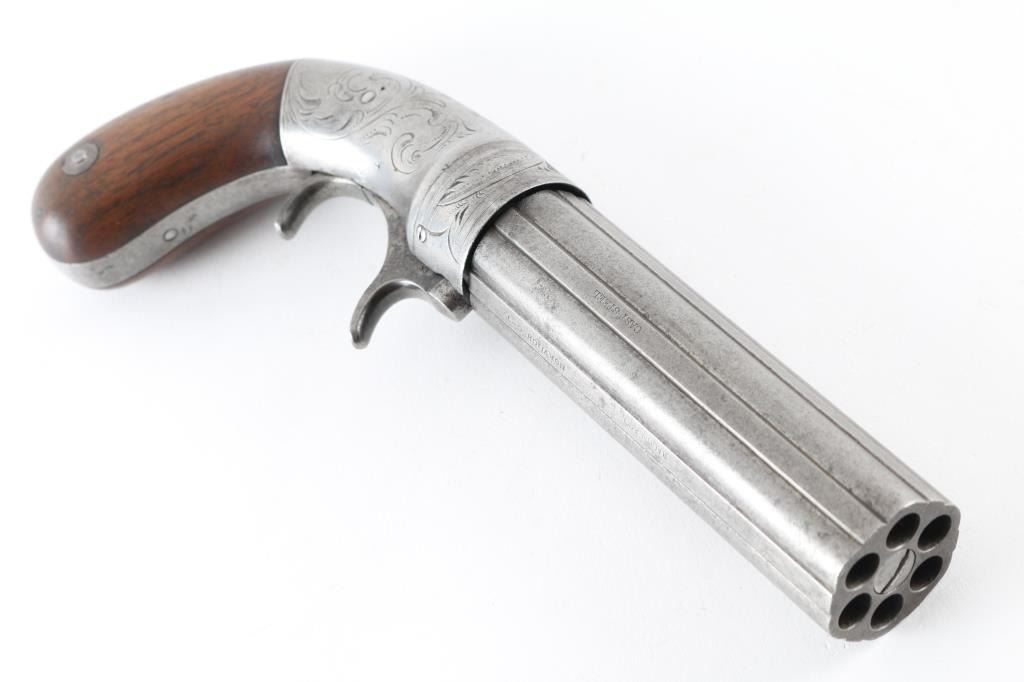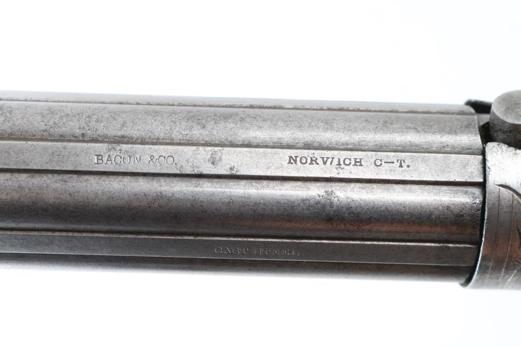 SN: 51. Early American under hammer .31cal 6 shot pepperbox pistol marked Bacon & CO, Norwich CT. Cast steel. NRA condition is good to very good with lightly cleaned metal and wood grip. Good action and works well. One of an estimated 200 Pepperboxes manufactured from 1852 to 1858.