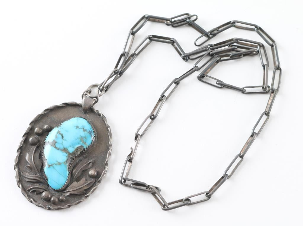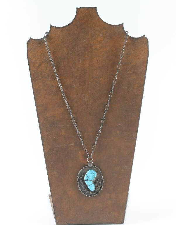 Sterling sliver pendant with single turquoise stone, on hand made paper clip chain. With a 11 inch drop in good condition.