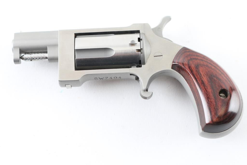 SN:SW7494 American made stainless steel single action miniature revolver chambered in .22 Magnum. Features a matte finish with polished cylinder and flats, 1 3/8" barrel, polished bead front sight, fluted five-shot swing out cylinder, serrated spur trigger, serrated hammer spur, and two-piece smooth laminated rosewood grips. Metal finish looks great. Grips look great. Bore looks good, needs cleaned. Comes with original black plastic case in cardboard sleeve, owners manual and NAA logo padlock with keys. Condition is NRA Very Good+ *Modern Firearm*