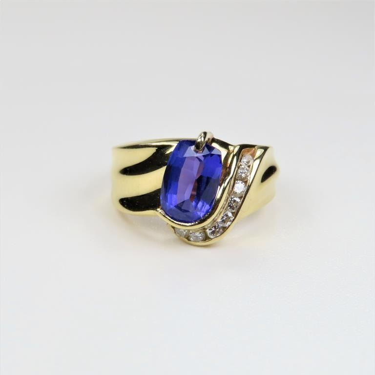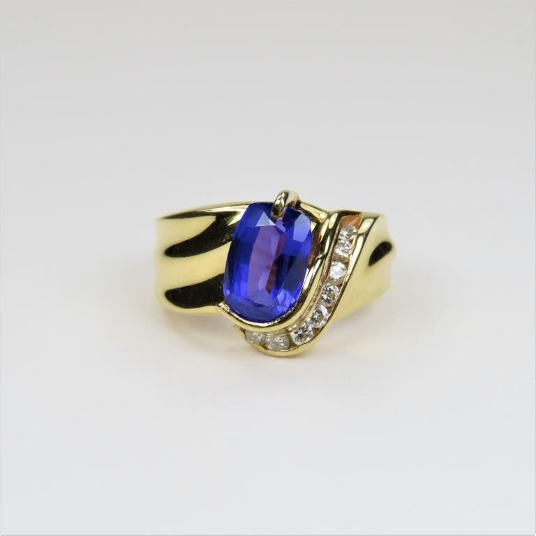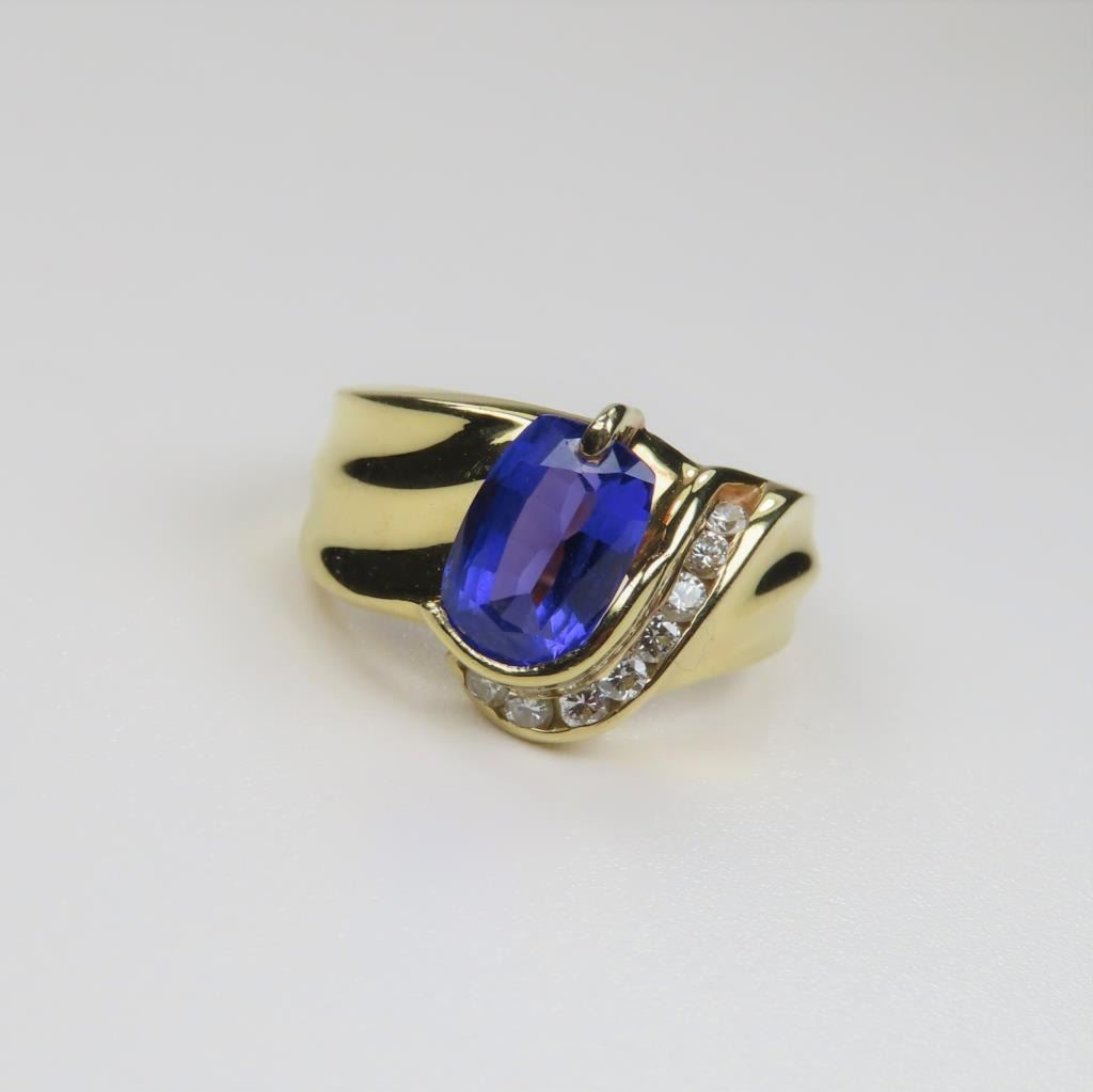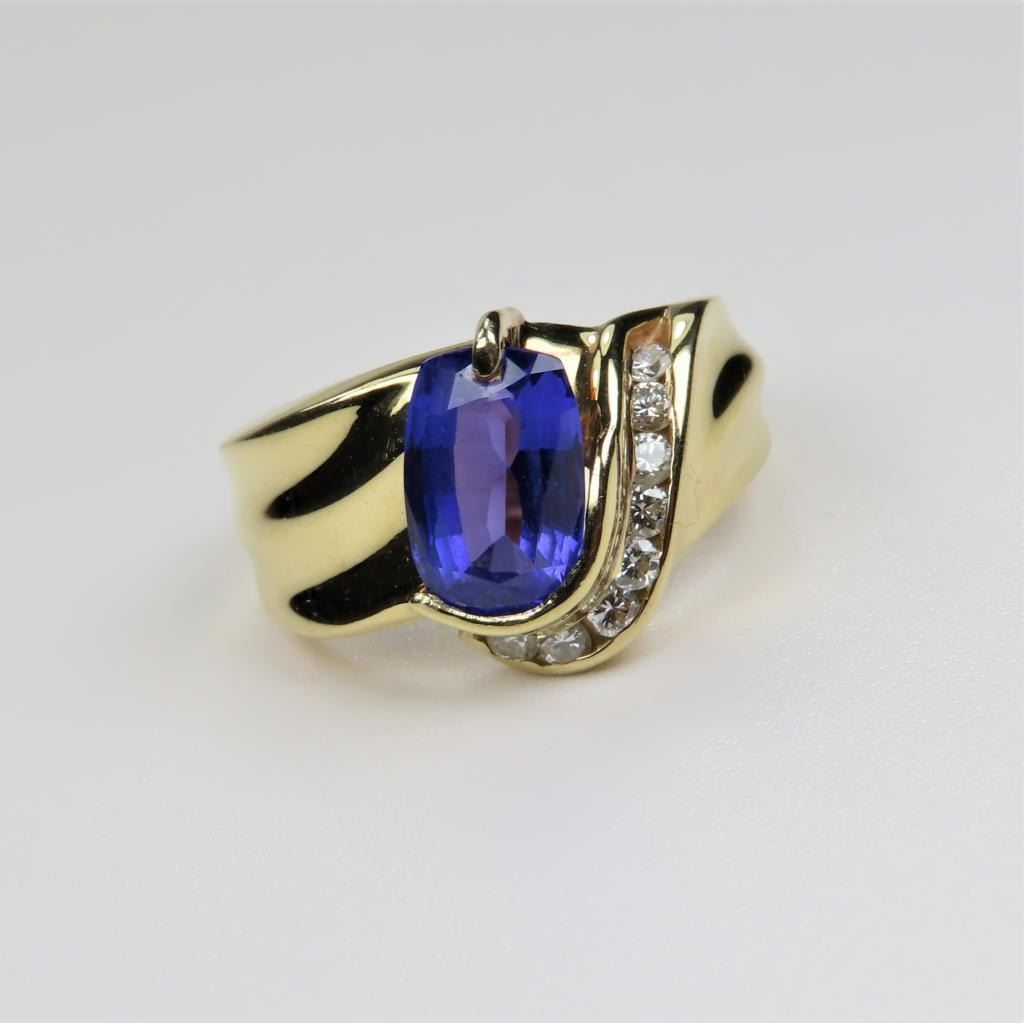 featuring an oval cut Tanzanite weighing approx. 3.00 carats with a Vivid Purplish-Blue color accented with 8 round cut Diamonds weighing approx. 0.25 carats with G-H colors and VS clarity set in a freeform style 14 karat yellow gold setting. Retail $3,000-$4,000