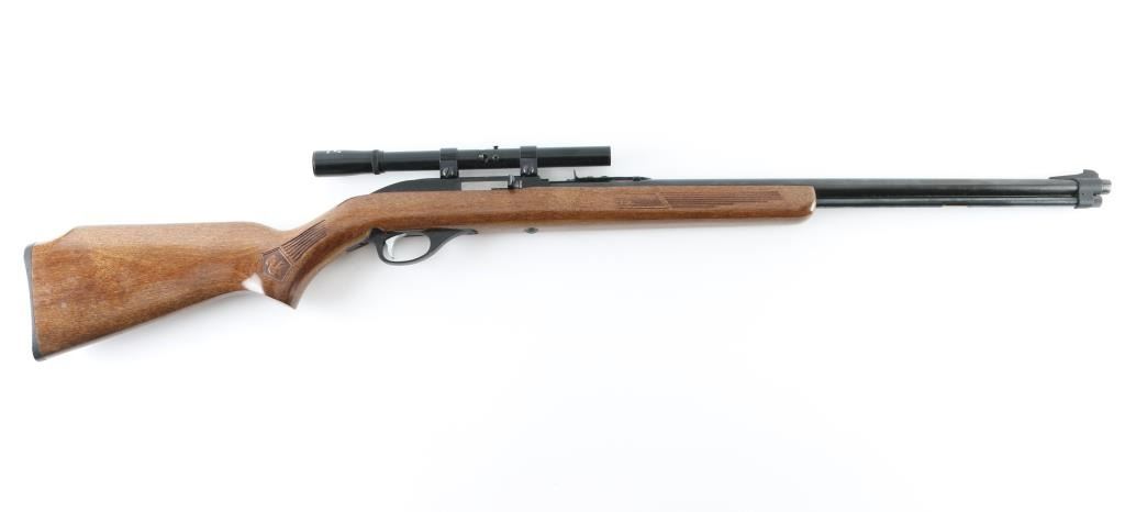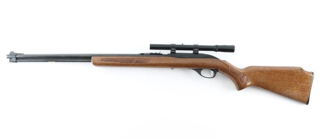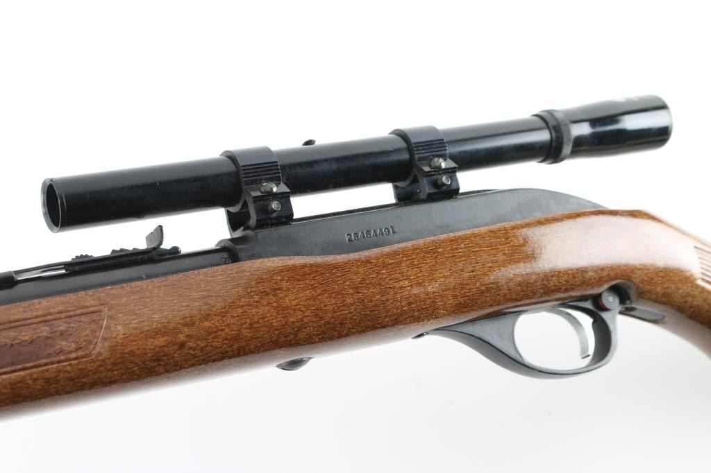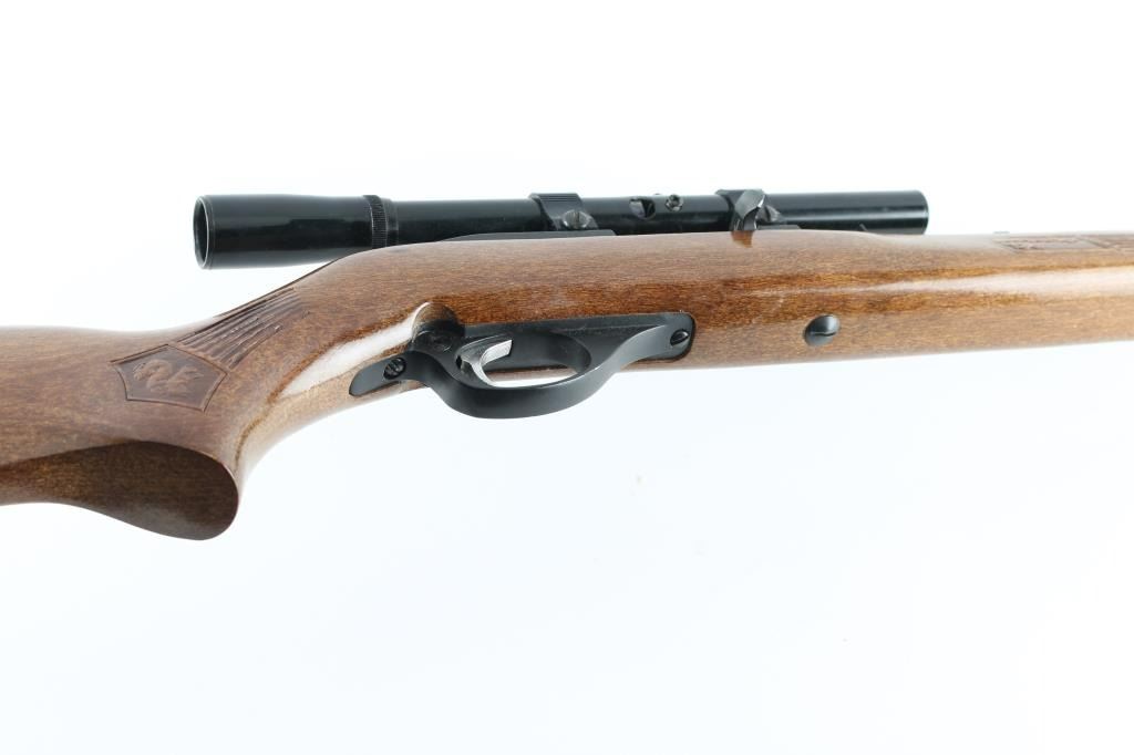 Semiautomatic rimfire rifle for 22 long rifle only. Features blued finish, wood stock with impressed grasping grooves and decorations, black plastic buttplate, 22" barrel, full length magazine tube under barrel, blade front & sporting rear sights, grooved receiver, push button safety. Bore is very good/bright.. Retains 98% blue with minor edge wear. Stock is very good. Mounts a good condition Glenfield 4x15 scope, clear view. NRA Condition-Very Good. Modern firearm.