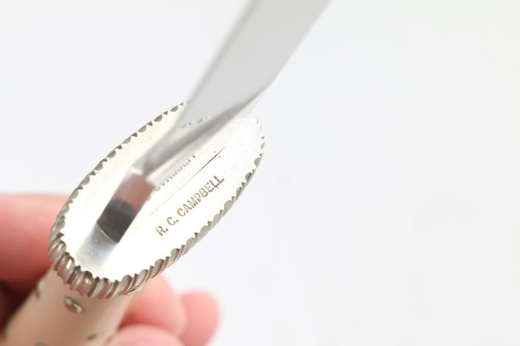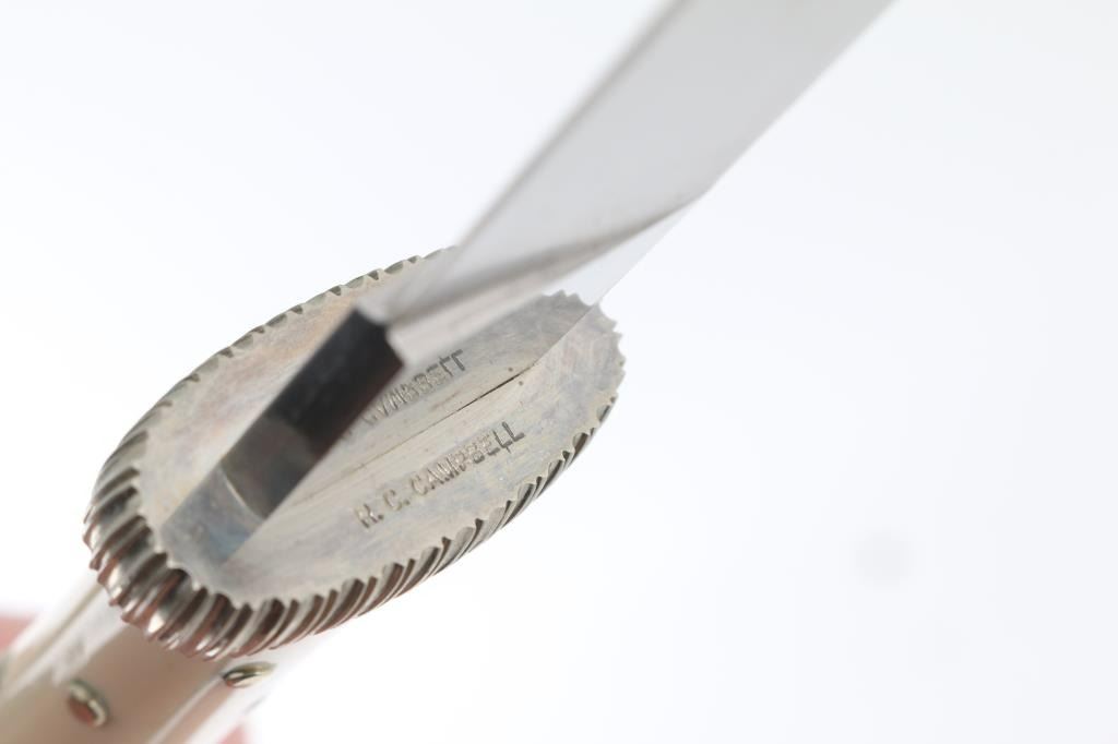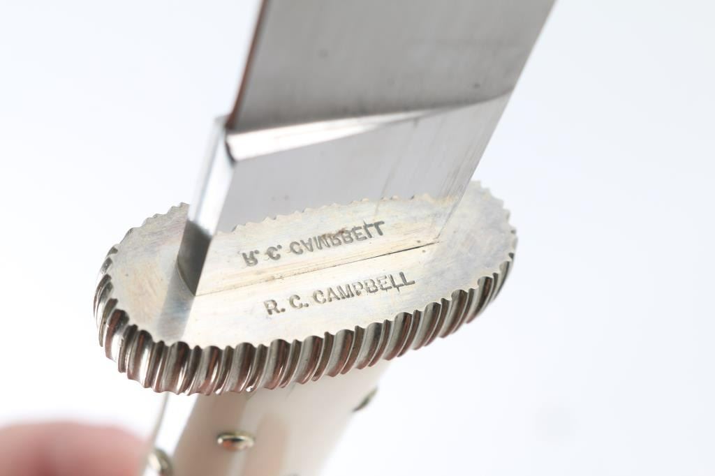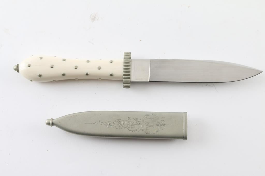 With Faux Ivory handle, knife is 10 inches overall with 5" blade, includes engraved metal sheath with hunting scene.