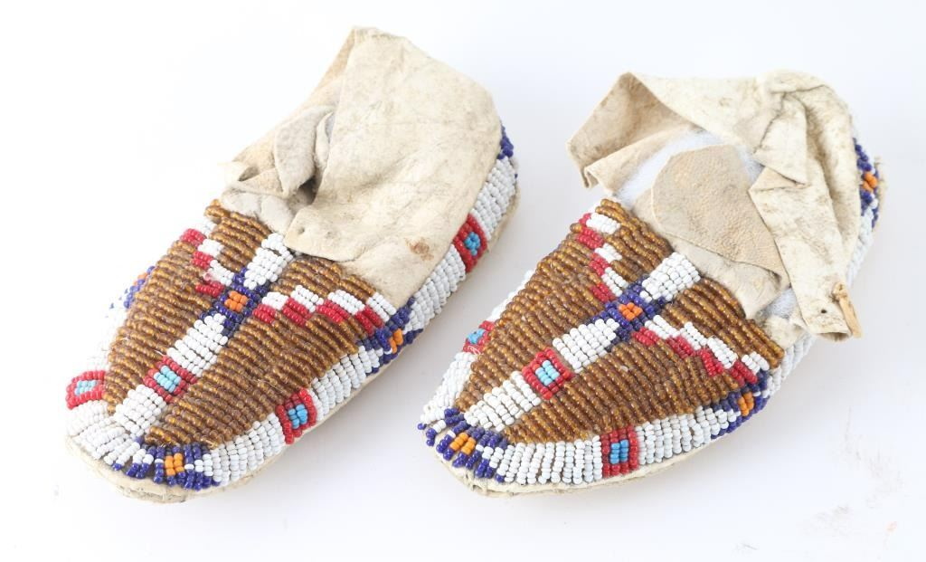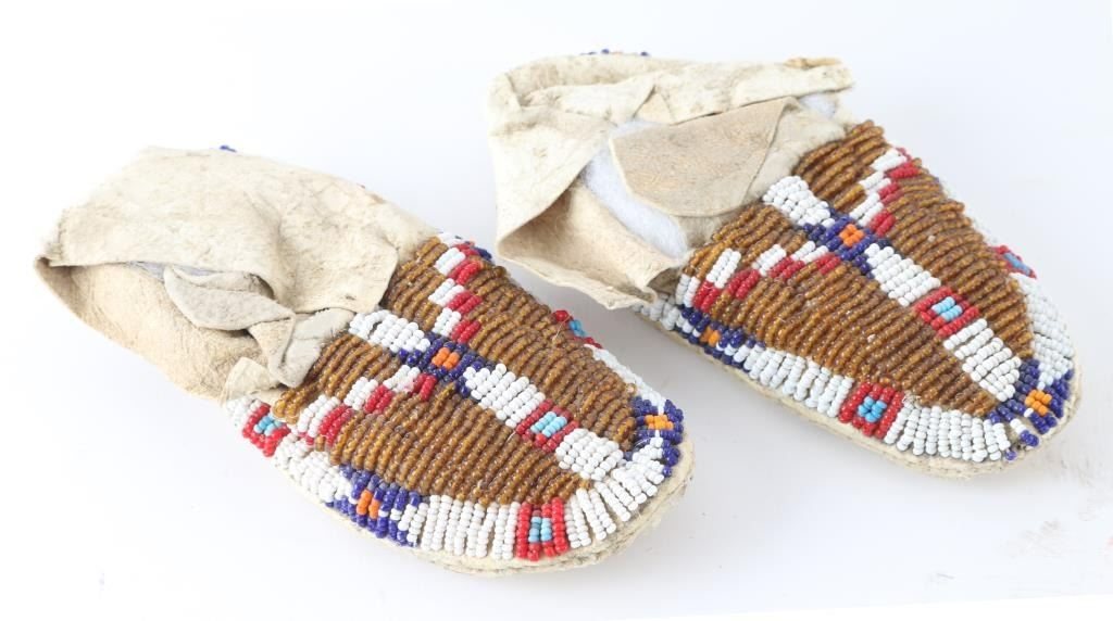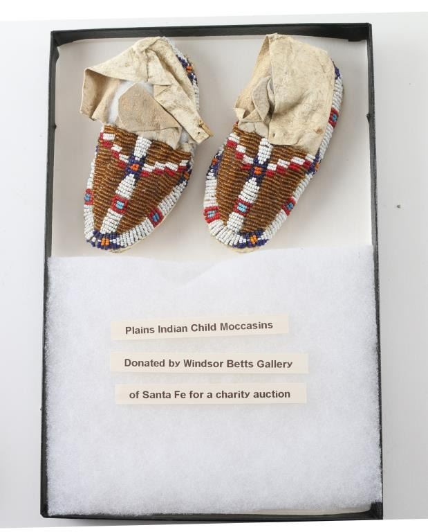Leather with fully beaded tops with geometric design. Purchased at a Santa Fe charity auction, donated Winser Betts gallery. Overall very good condition
