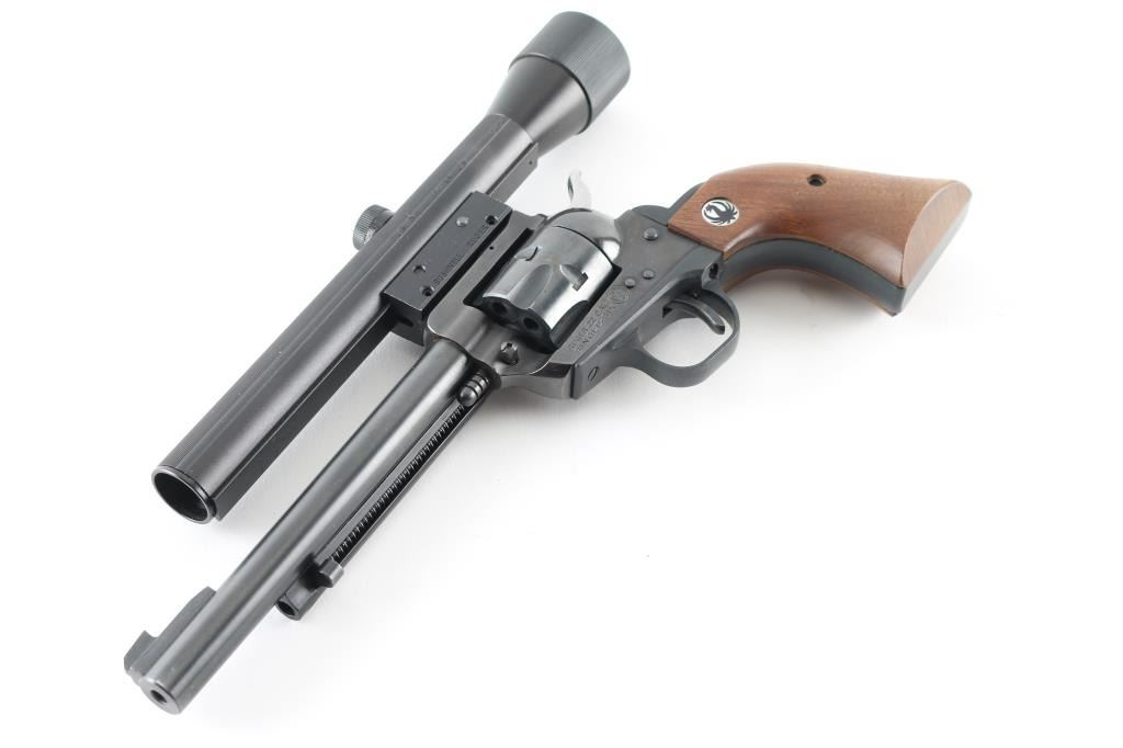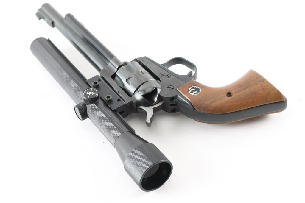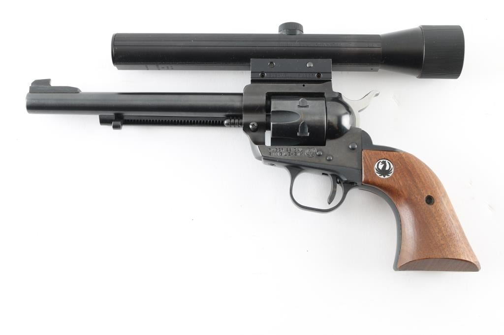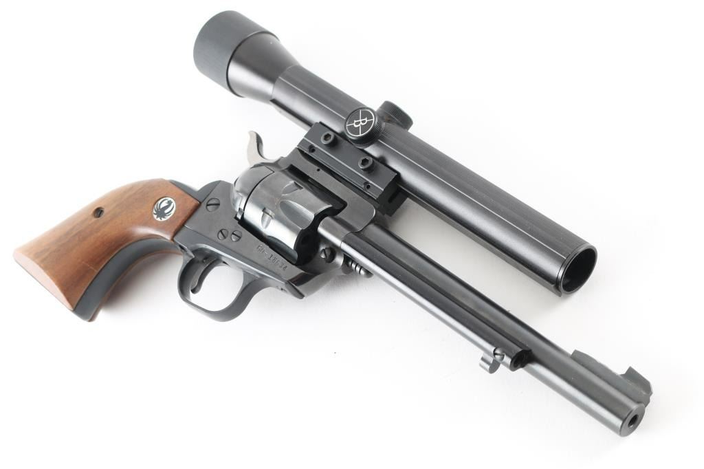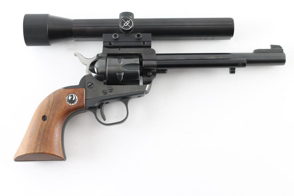 American made six shot revolver chambered for .22 caliber ammunition circa 1970. Ruger referred to this model as the "Super Single Six". It has a 6.5" blued barrel and matching frame, raised blade front sight, rear sight has been removed and replaced with a Bushnell Phantom II 2.5x scope mounted on a Bushnell Ruger base. Two piece wood grips with Ruger medallions on both grips. Metal finish looks great with only two tiny imperfections in the metal on the right side of the top strap. Wood grips look very good. Bore looks pristine. Comes with one magnum cylinder. Condition is NRA Excellent *C&R Firearm*