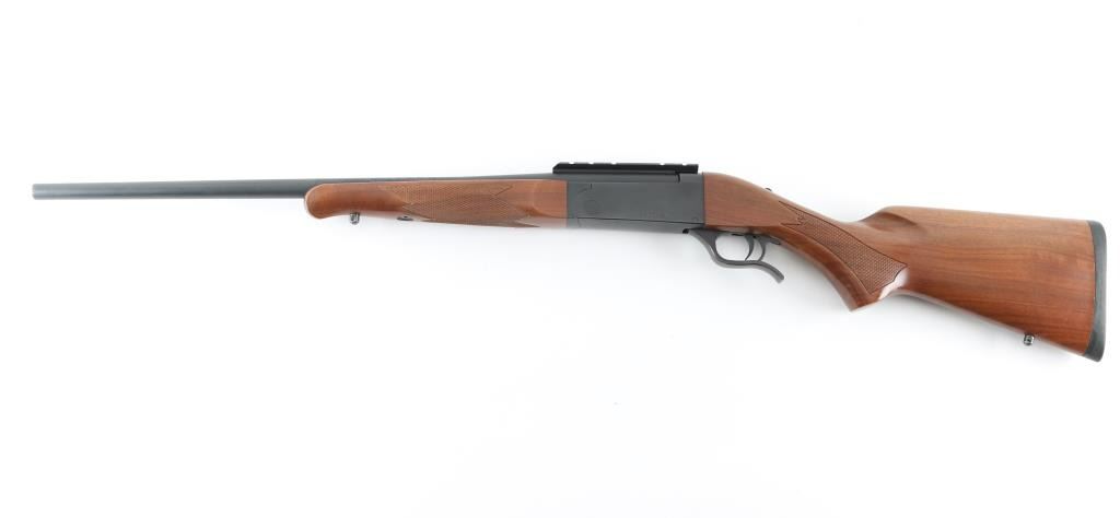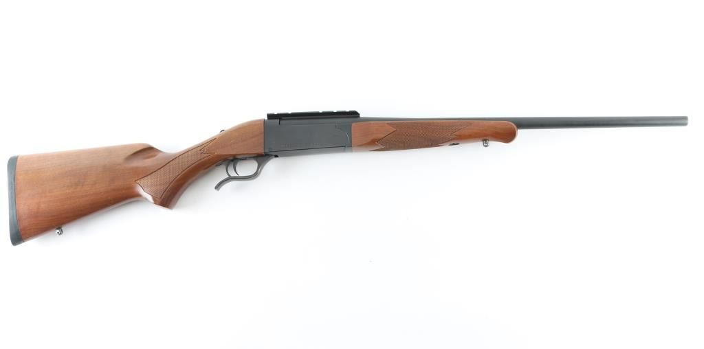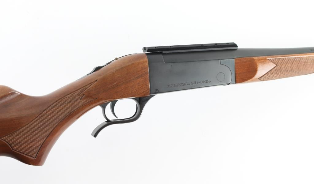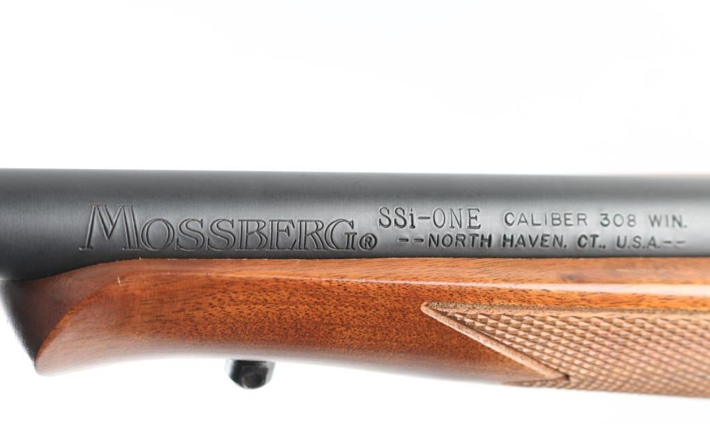 SSi-One - short for "single-shot interchangeable offers users the opportunity to swap barrels to different calibers and even a 12 gauge barrel was available. The barrels each came with its own walnut forend. These guns are no longer in production. This one is a single-shot, lever-opening, break action design with a 24" barrel with a recessed crown chambered for .308 WIN. It features a matte metal finish, walnut stock checkered at the wrist and on the schnabel forend. It sports swivel studs, a top tang safety, cocking indicator, rubber Mossberg recoil pad and scope base, There are no provisions for sights. The metal finish looks very good with one slight loss of blue at the muzzle. Wood stocks look very good with almost no signs of handling. The bore looks pristine, very bright. Gun looks near new. Condition is NRA Excellent *Modern Firearm*