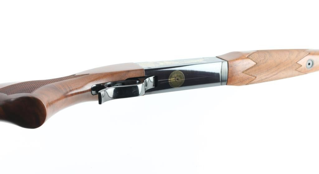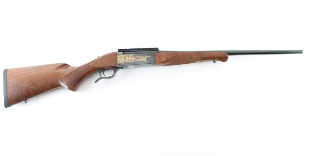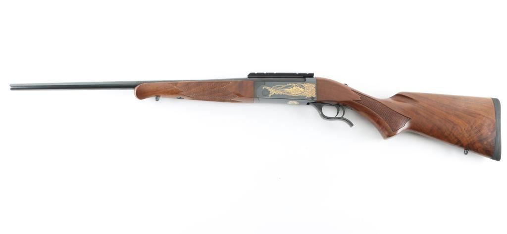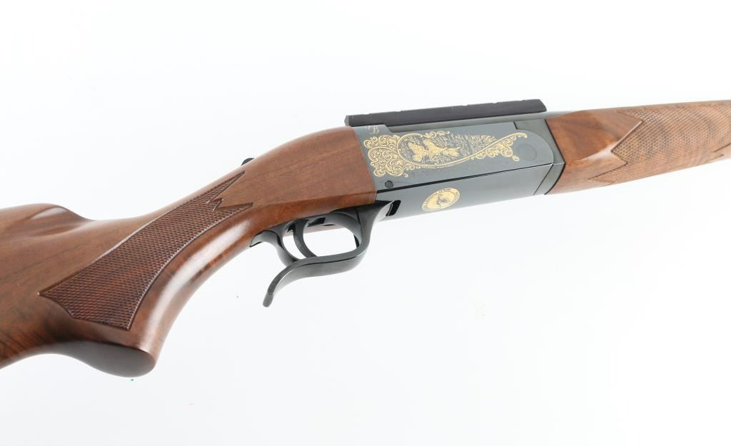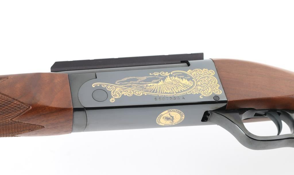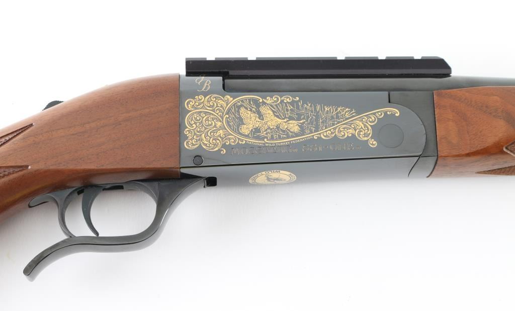 This is a Special Edition National Wild Turkey Federation SSi-One chambered for 30-06 Sprg ammo. SSi-One is short for "single-shot interchangeable and offered users the opportunity to swap barrels to different calibers and even a 12 gauge barrel was available. Each barrel came with its own walnut forend. This one is a single-shot, lever-opening, break action design with a 24" barrel with a recessed crown chambered for 30-06 Sprg. It features a high polish metal finish, walnut stocks checkered at the wrist and on the schnabel forend. It sports swivel studs, a top tang safety, cocking indicator, rubber Mossberg recoil pad and scope base, There are no provisions for sights. Both sides of the receiver have a gold tone field scene and reads National Wild Turkey Federation and the bottom of the receiver has the NWTF logo in gold tone. The metal finish looks great. Wood stocks look great with one small surface scratch on the left side of the butt stock. The bore looks very good but needs cleaned. Gun looks near new. Condition is NRA Excellent *Modern Firearm*