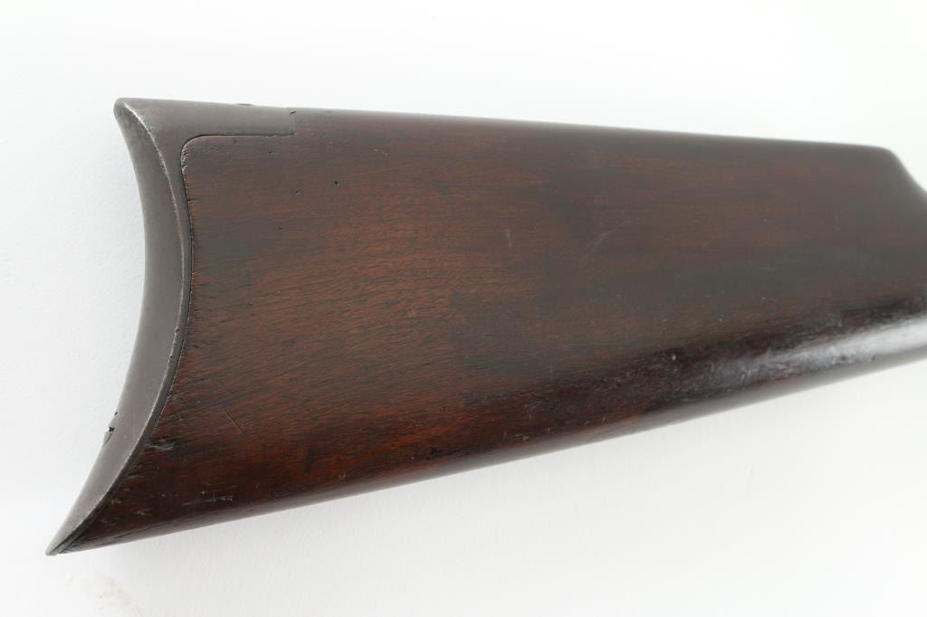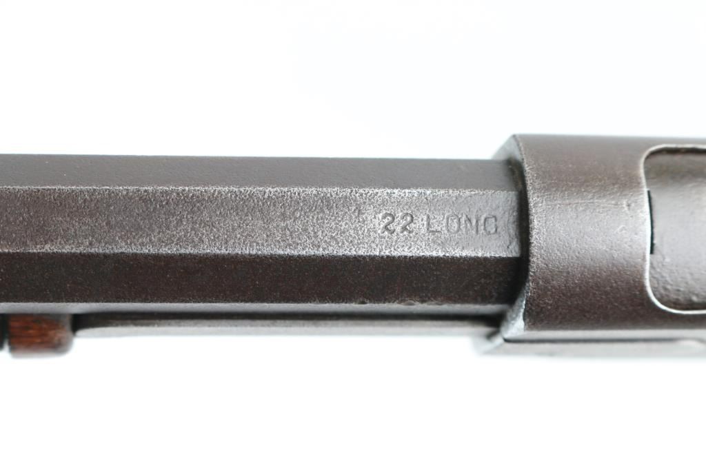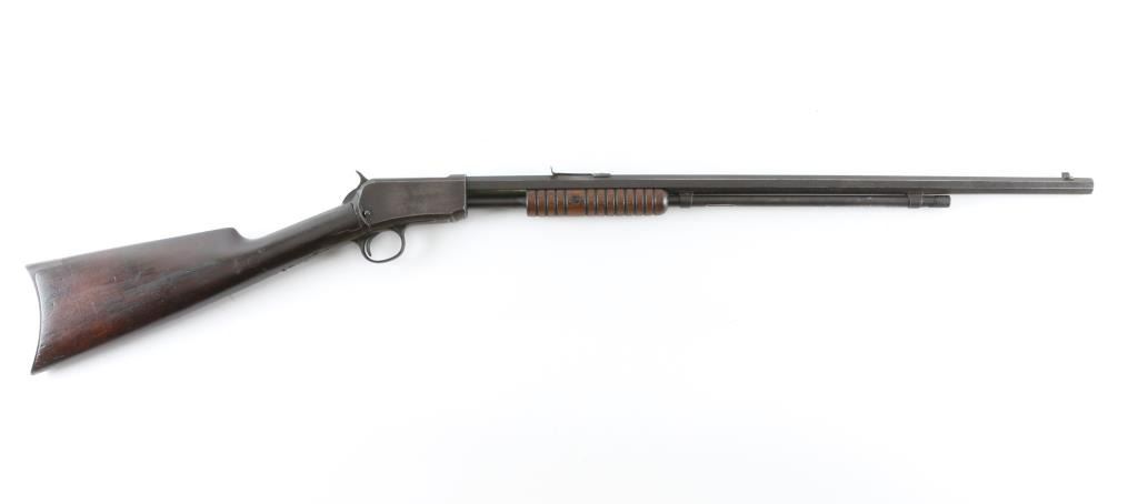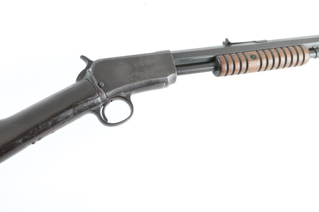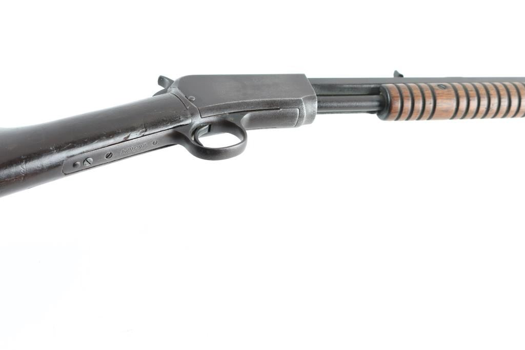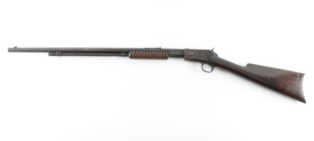'Second Model' pump action rimfire rifle manufactured circa 1905. Features 24" octagon barrel, dovetailed blade front sight. screw adjustable rear sight, 2/3 length magazine tube under barrel, exposed hammer, grooved walnut pump handle, smooth walnut shoulder stock, semi crescent buttplate, take down screw on receiver left side. Bore is fair condition, a bit dark and lightly pitted throughout, with good rifling present. Metal surfaces show a deep brownish gray color, slightly rough texture from old pitting, dings to edges of barrel flats. Numbers match on receiver and tang, fairly crisp on lower tang, very faint and almost lost among many small pits on bottom of receiver. Barrel markings faint but clear. Wood is good condition, very good at pump handle, showing some slight shrinkage at tang and point of toe. Varnish added to butt. Condition is NRA Good *** C&R Firearm ***