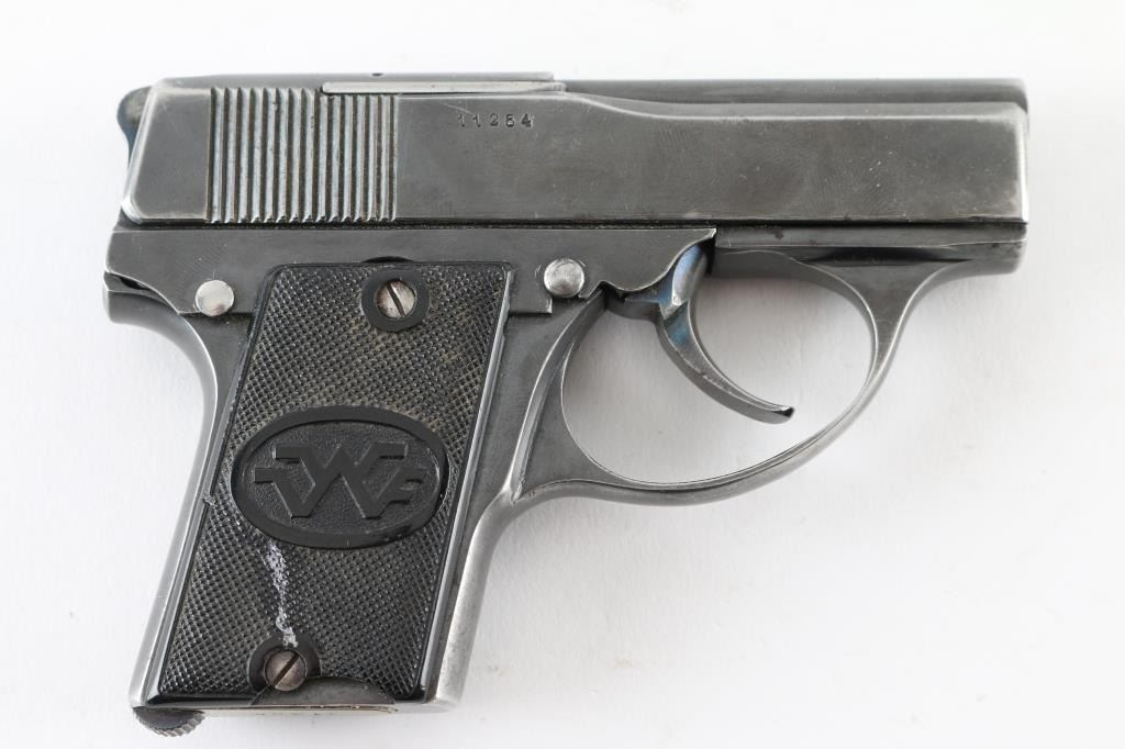 SN: 11254 Small semiautomatic pistol manufactured circa 1921. Features blued finish, black checkered composition grips, 2.25" barrel, open top slide with no sights, double action trigger, exposed ring hammer, manual safety, heel magazine release. Bore is good, lightly pitted. Retains 60% finish, turning gray, with edge losses, some bright blue remaining on trigger & safety. Left grip panel is good or better with "Little Tom" embossed. Right grip panel is cracked (repaired), small piece missing, "WWF" embossed. Includes one magazine. Condition is NRA Good++ *** C&R Firearm ***