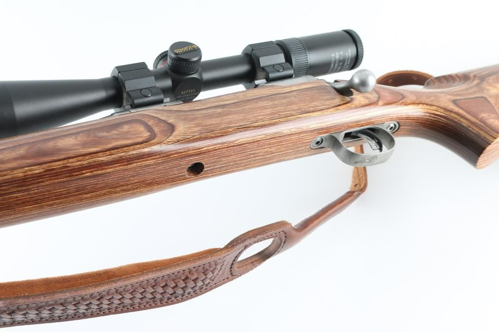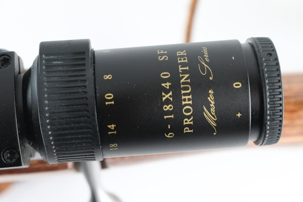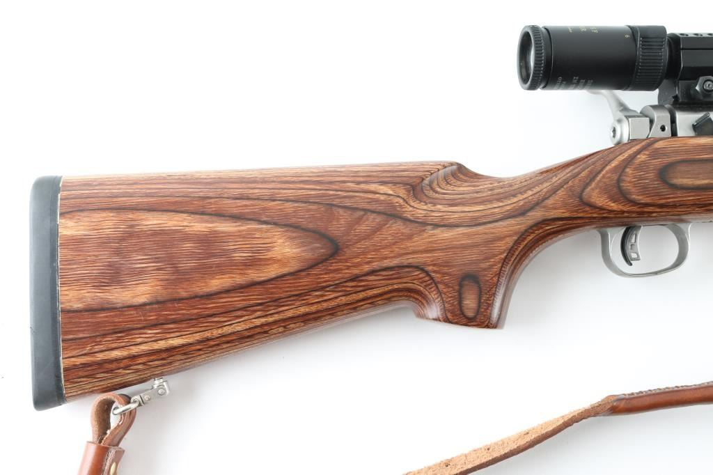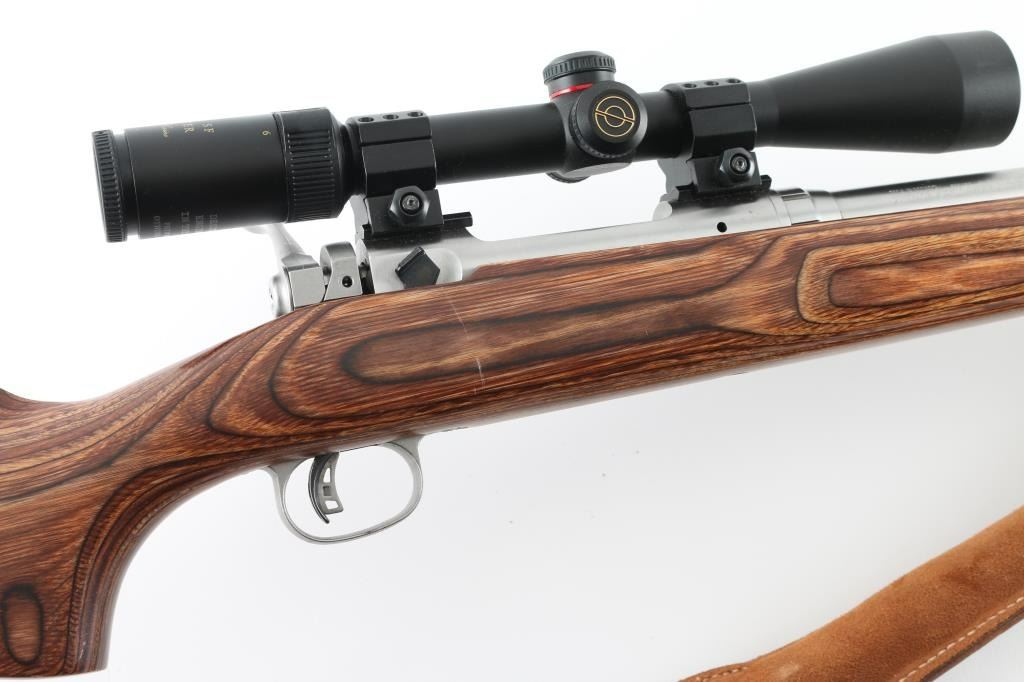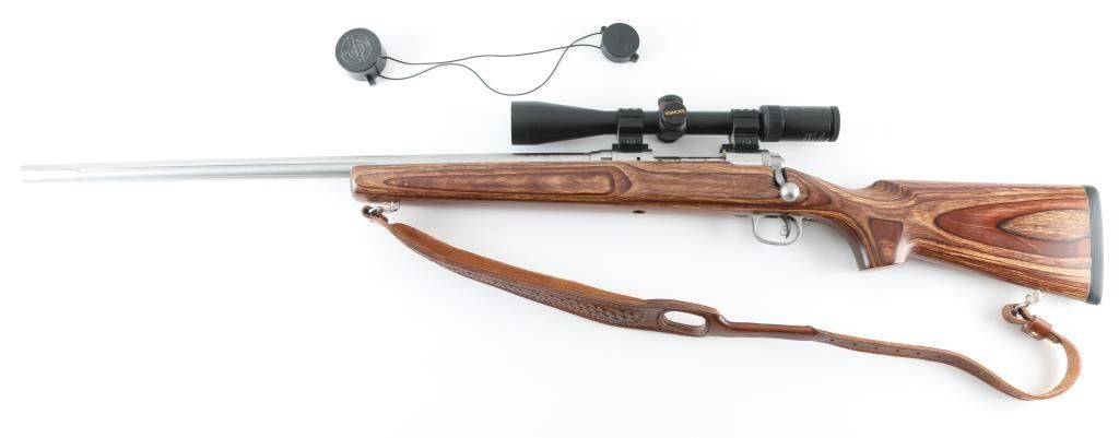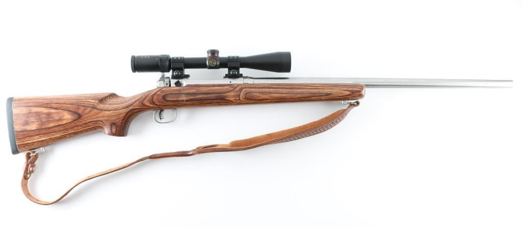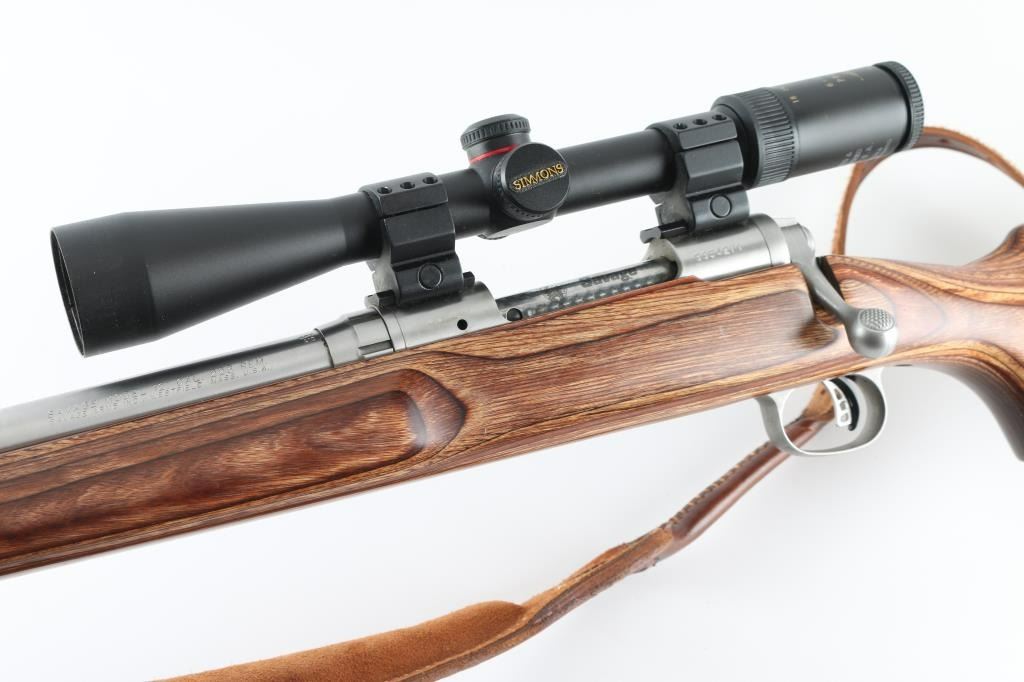 American made Left Hand bolt action sporting rifle chambered in .223 Remington circa 2004. Features a 26" fluted satin stainless heavy barrel with recessed target crown & no provisions for sights. It has a 4 shot internal box magazine, jeweled bolt, matte finish bolt handle, brown laminated wood stock with swivel studs, leather sling, thin rubber butt pad, tang safety and Savage AccuTrigger. Metal finish looks great. Wood stock looks very good with a small spot on the right of the shoulder stock (barely noticeable). Bore looks very good but dusty. Comes with a Simmons 6-18x40 SF Prohunter Master Series scope with rings and bases. Optics are clear. Condition is NRA Excellent *Modern Firearm*