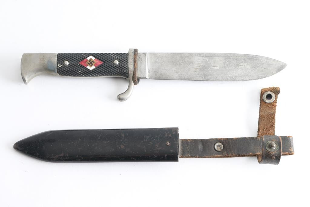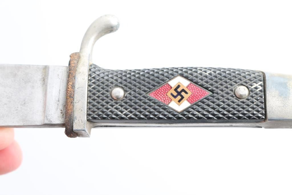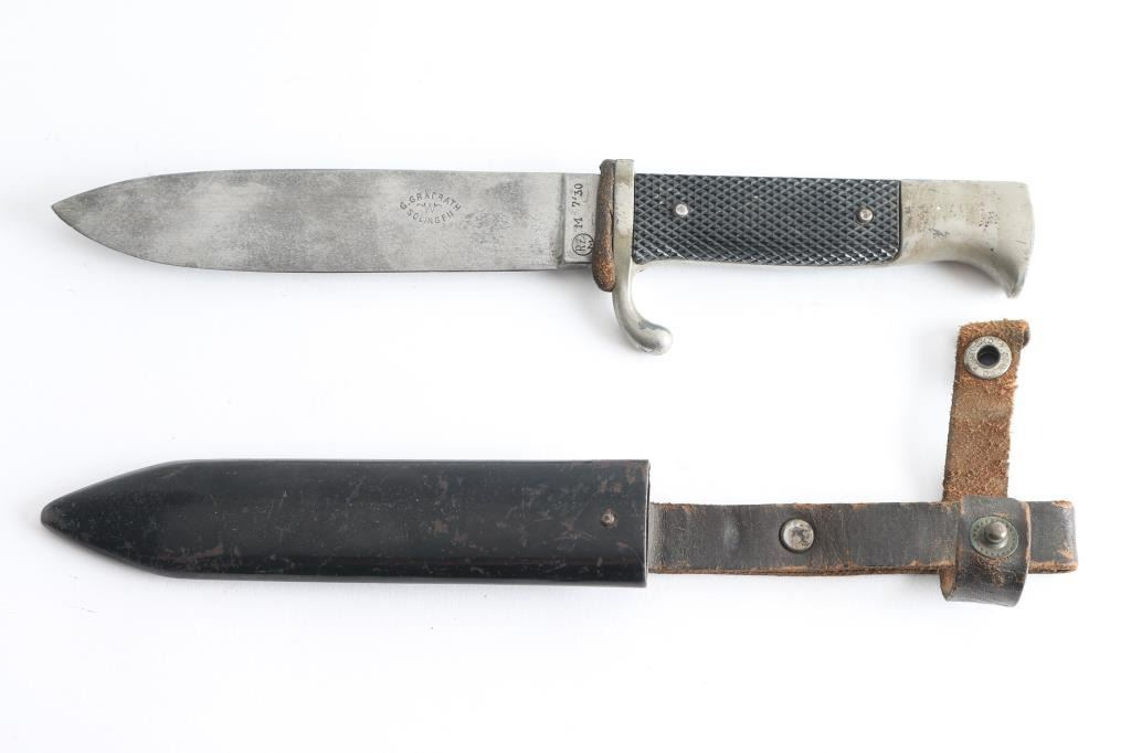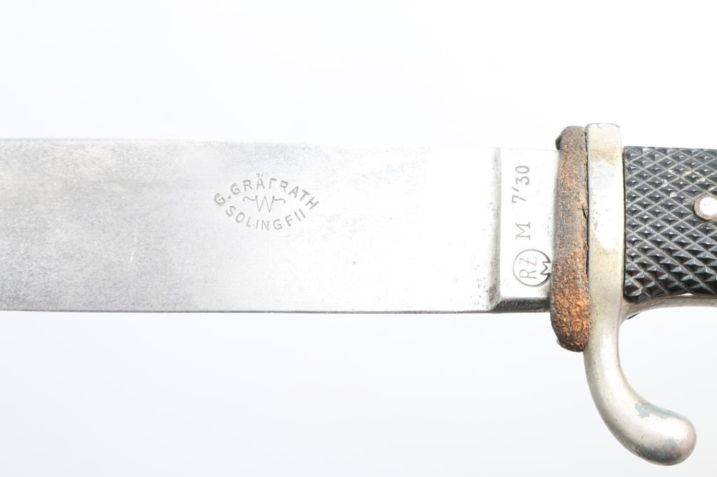Original Transitional HJ knife both maker, and RZM marked. Ricasso marked "RZM M 7/30", and blade marked "G.Grafrath, Solingen". There is some play in the HJ diamond, leather washer in place. Blade has not been sharpened like a lot of these were. Grips are very good. Some handling wear to the pommel. Scabbard has some scratches, but paint is mostly there. Overall nice condition.
