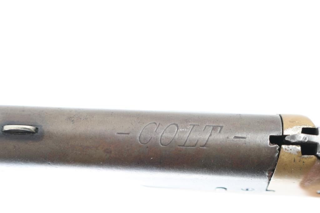 Early Colt Thuer standard model single shot spur trigger derringer chambered in .41 Rimfire. Features a 2.5" pivoting barrel, silver front sight, brass colored frame, blued spur trigger & sloping hammer and walnut bird's head grips. Finish on barrel mostly gone, turned a gray patina. Brass color on frame has some handling loss. Colt engraved on top of barrel still pretty strong. Bore has some areas of rust/pitting with rifling present.. Wood grips are good. left frame marked ".41 Cal." Action is crisp/tight. NRA Condition-Very good as Antique