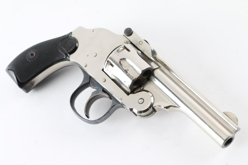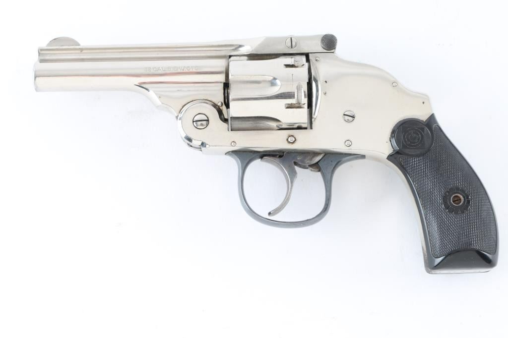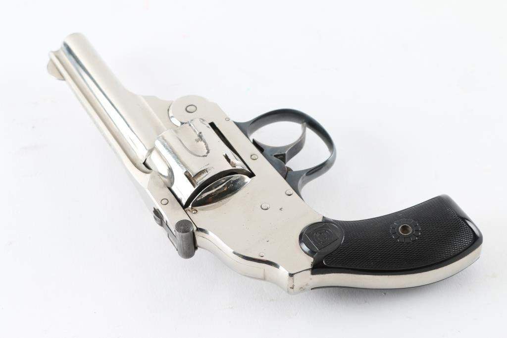 SN: 107621 'Second Model' double action break-top revolver. Features nickel finish, blued trigger & guard, checkered black composition grips with target logo, fluted six shot cylinder, 3.2" barrel, fixed sights. Bore is fair to good, lightly pitted with strong remaining rifling. Retains 80% finish, with slight clouding, some discoloration, no observed flaking or peeling, patch of patina at butt. Grips are good to very good. Action operates smoothly with good lock-up, trigger return is a bit weak. Condition is NRA Good+ *** C&R Firearm ***