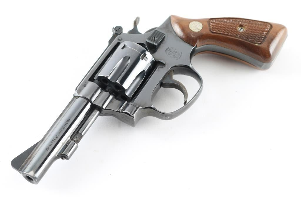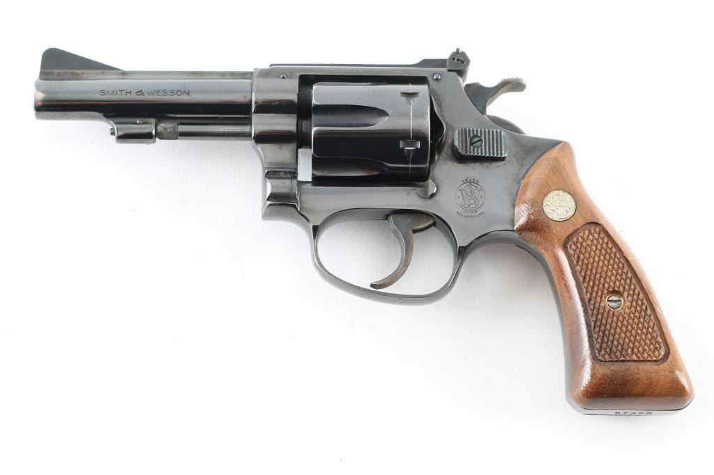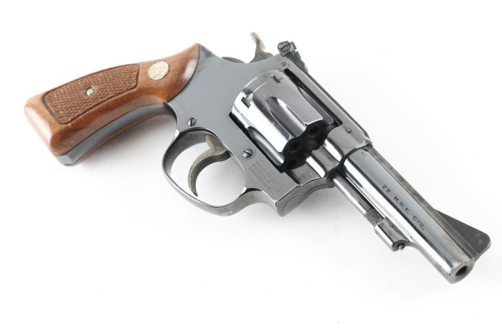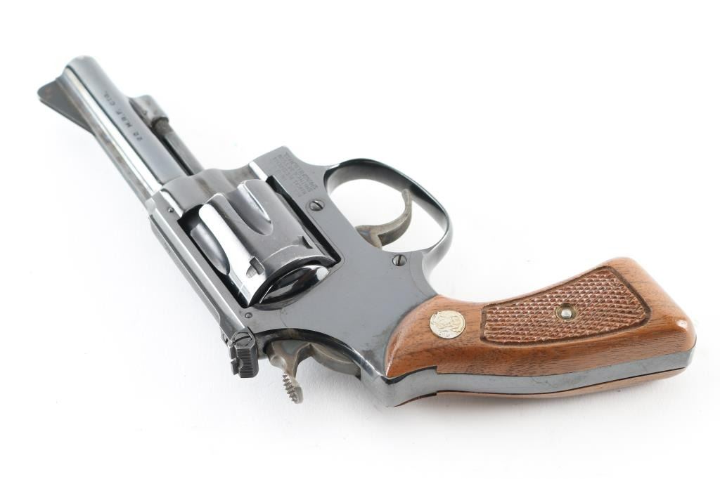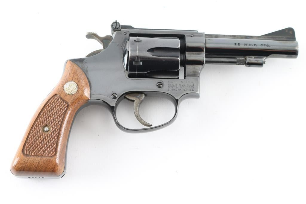 '1960 Kit Gun Magnum Rimfire' double-action revolver chambered in .22 Winchester Magnum Rimfire. With no M prefix to the serial number and no diamond grip it makes this circa 1968. Features a blued finish, pinned 3 1/2" barrel with narrow rib, non-shrouded ejector rod, serrated ramp front sight, micrometer click adjustable rear window sight, fluted six-shot cylinder with recessed chambers, serrated trigger, semi-target hammer, square-butt J target frame and two-piece checkered walnut Magna grips with S&W medallions. Metal finish looks good with a small loss of blue at the muzzle, ejector rod, trigger guard and a drag line on the cylinder. Wood grips look good with one tiny scuff on the left grip in front of the S&W medallion. Bore looks very good, dusty. Condition is NRA Very Good *C&R Firearm*