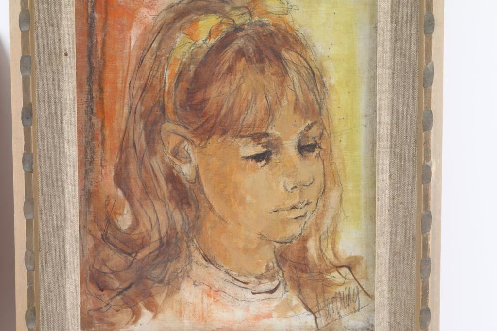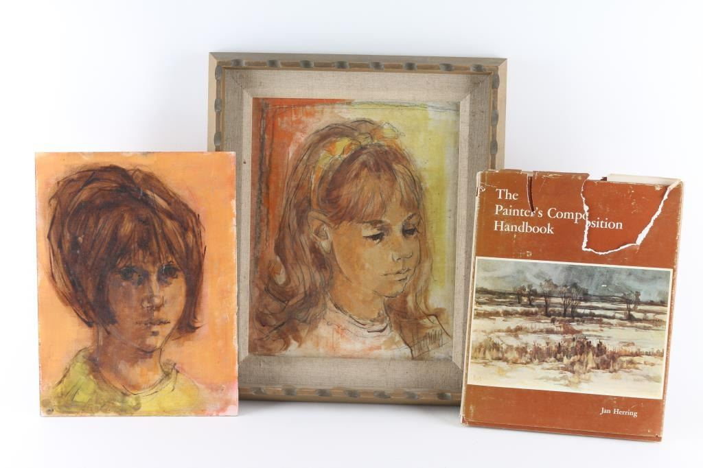 By "Jan Herring" signed lower right. Also Included is a signed book by Jan Herring. Janet Mantel Herring (Born 1923) was active/lived in Texas, Montana. Janet Herring is known for painting & writing, and as an educator. Both oils depicting young women. Both measuring 12x9.5", one framed in wood frame, both in good condition.