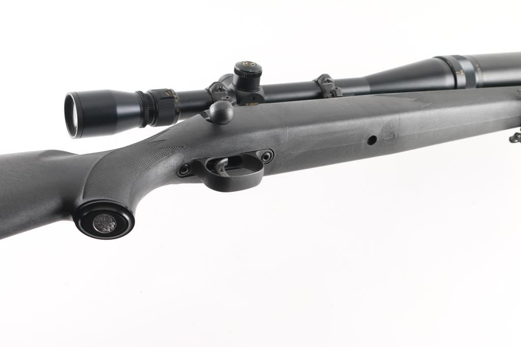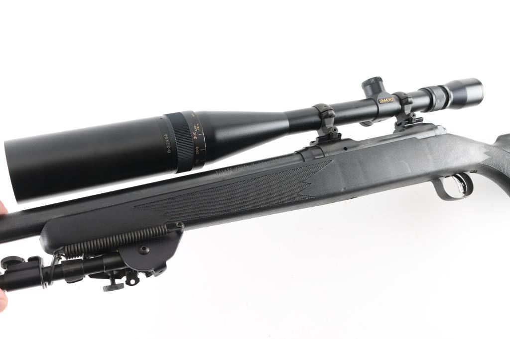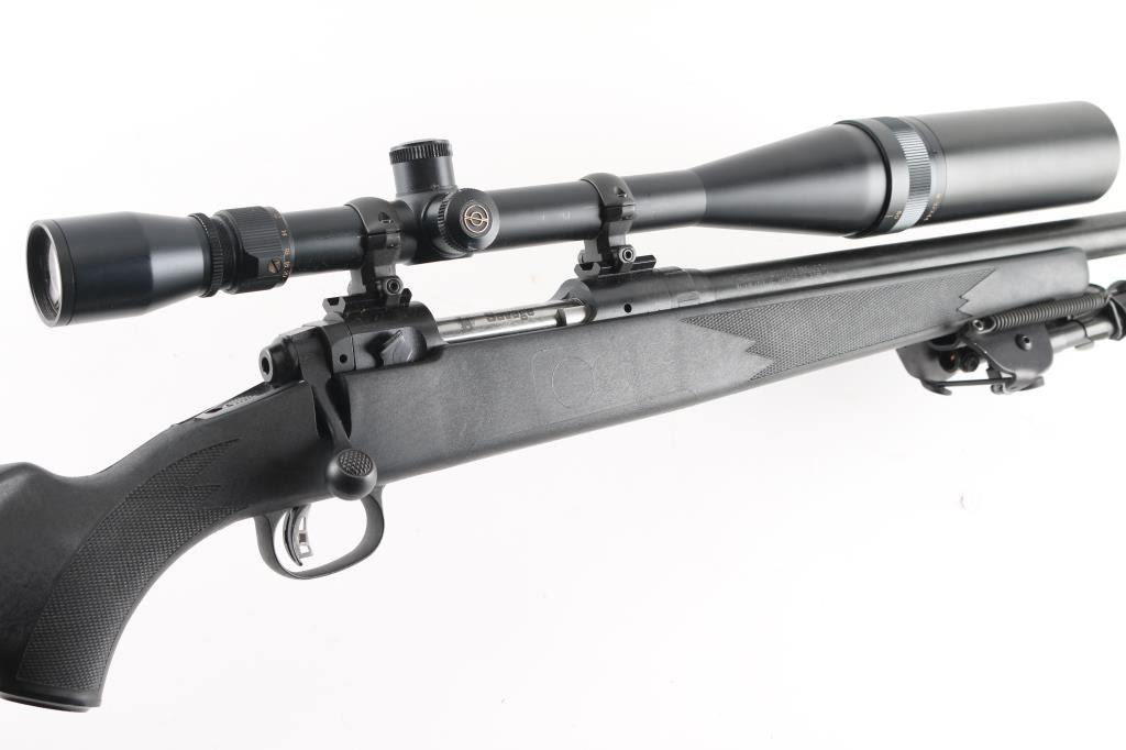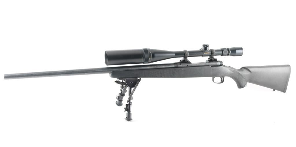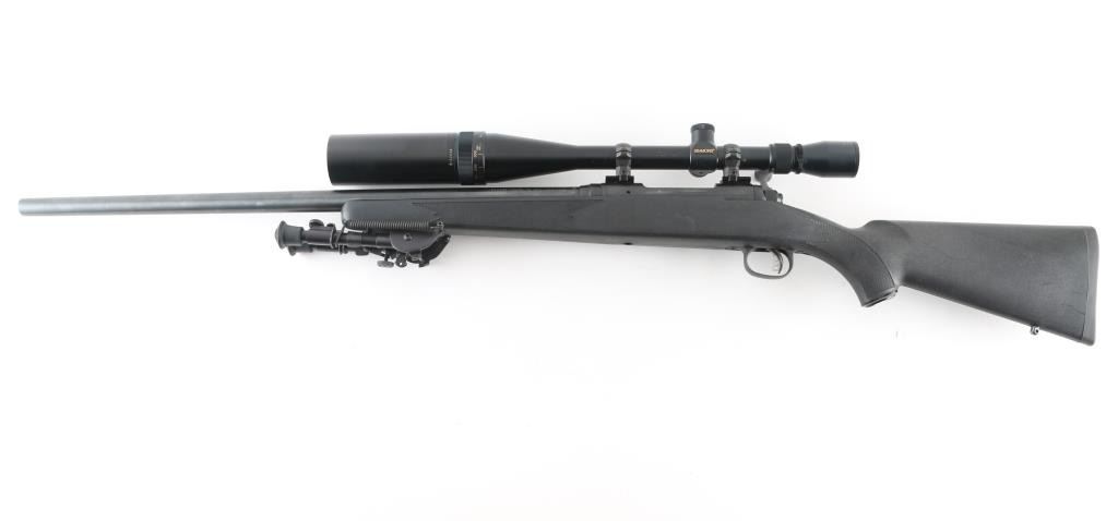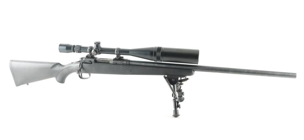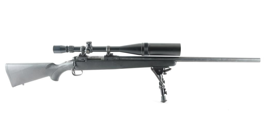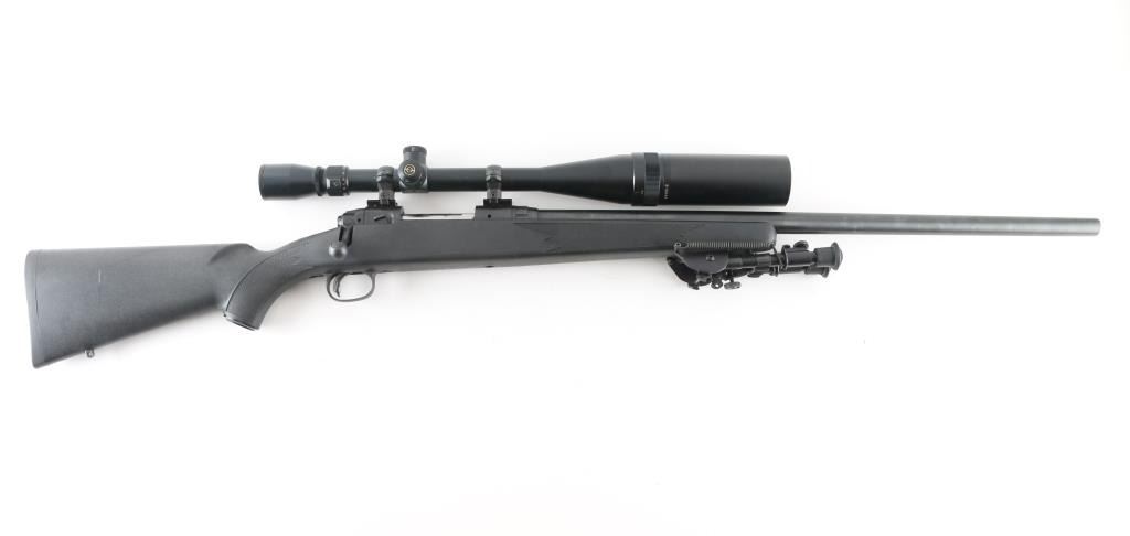 American made bolt action sporting rifle chambered in .223 Remington. Features a blued finish, 26" heavy barrel, no provisions for sights, sliding safety on the rear of the receiver, polished bolt, internal box magazine, swivel studs, and fancy checkered black synthetic pistol grip shoulder stock with rubber recoil pad. Rifle exhibits approximately 95% of it's original finish showing scattered scratches, and minor edge wear. Action is smooth, bore is excellent, and the synthetic stock is very good with minor scratches. Mounted with a Simmons 8-32x44 scope, Model 800116, clear optics, Bipod attached to forearm. Good condition. Great varmint rifle. Condition is NRA Very Good. Modern Firearm.