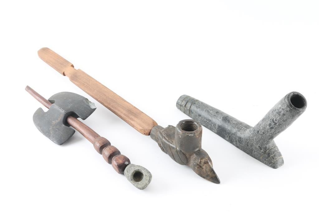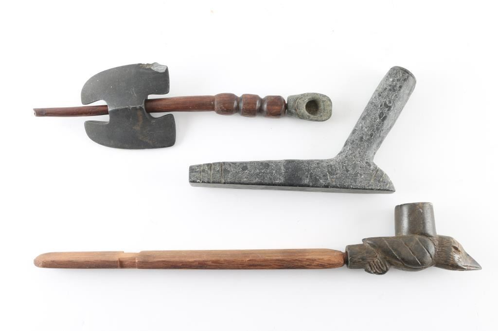 Including one native American bird stone pipe and stem, measures 13 inches overall. One native American pipe with stone, measuring 11 inches overall. Also includes handmade gray stone pipe, measures 7.5 inches overall.