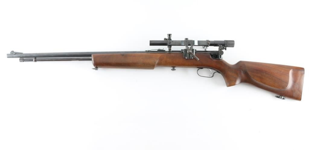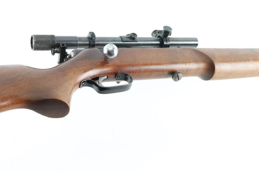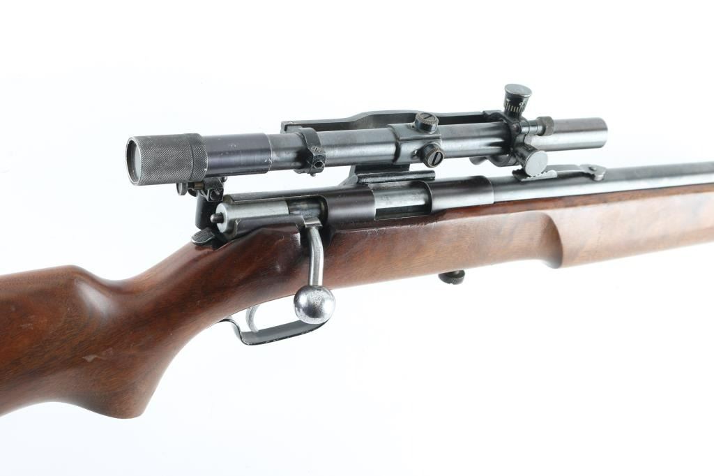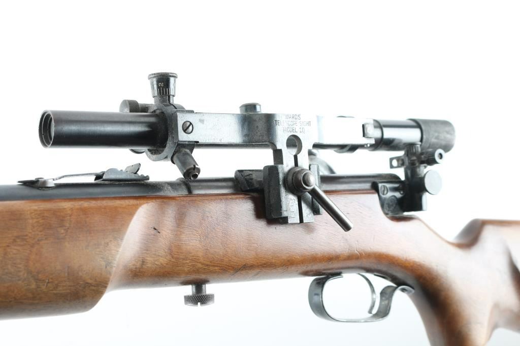 This .22 Cal. bolt-action is a Mossberg 45A, made for the Montgomery Ward Co. Circa 1930's Top of the line of the Western Field .22's. 24" barrel with sporting sights, and a side mounted Mossberg No. 4 peep sight. Also mounted with a Wards model 10 scope with clear optics. Action is smooth/tight. blued finish is very good with plum colored receiver. Fed from a tube magazine. One piece stock with contoured forearm, sling swivels, Steel buttplate, and cheek piece. Wood is very good. Bore appears excellent/bright. NRA Condition-Very Good C&R Firearm.