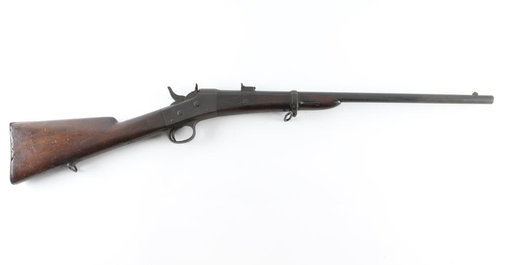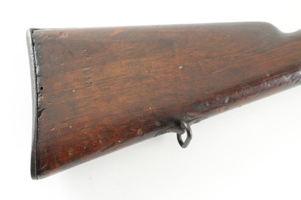 Spanish military one band carbine. Features approx 23" barrel, two position flip style rear sight, sling swivels. Bore is bright with rifling, but has areas of pitting. Metal has turned a brownish patina color, with all metal showing pitting. Wood is in good serviceable condition with numerous dents and gouges., some worm holes by the buttplate. Serial number and Oviedo 1877 cartouche stamped on butt. No visible markings on the metal. Condition is NRA Fair Antique Firearm