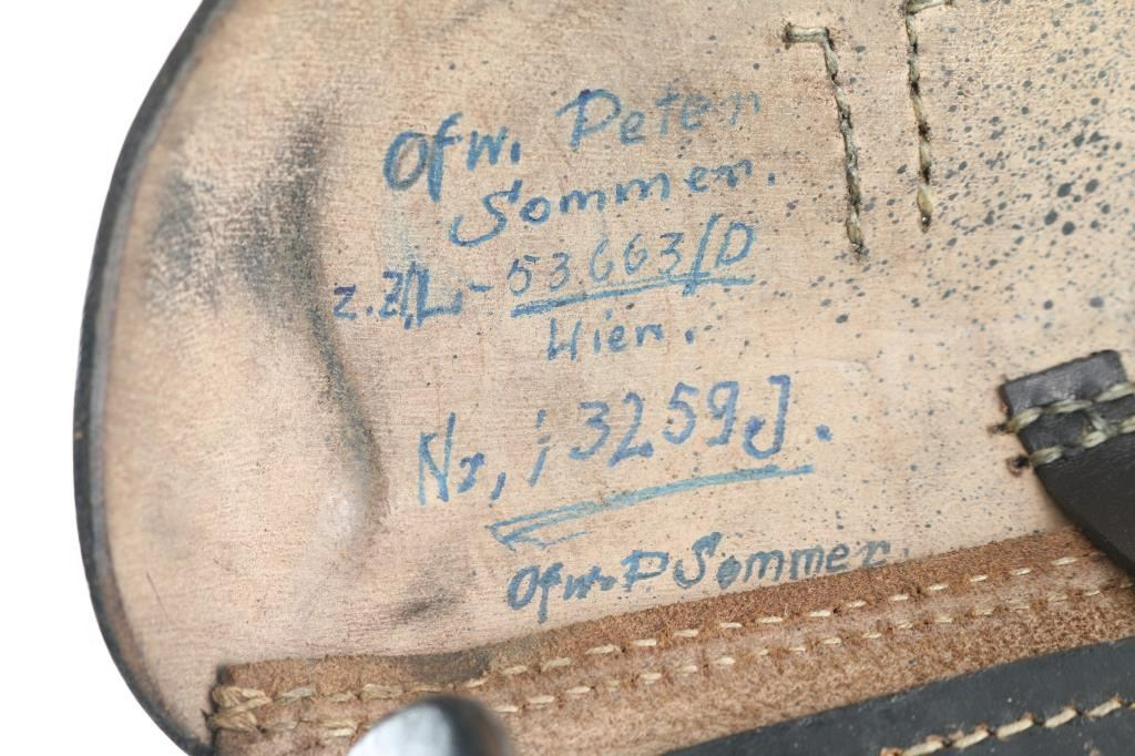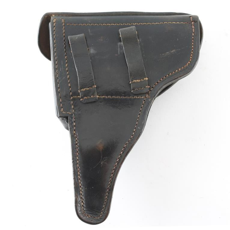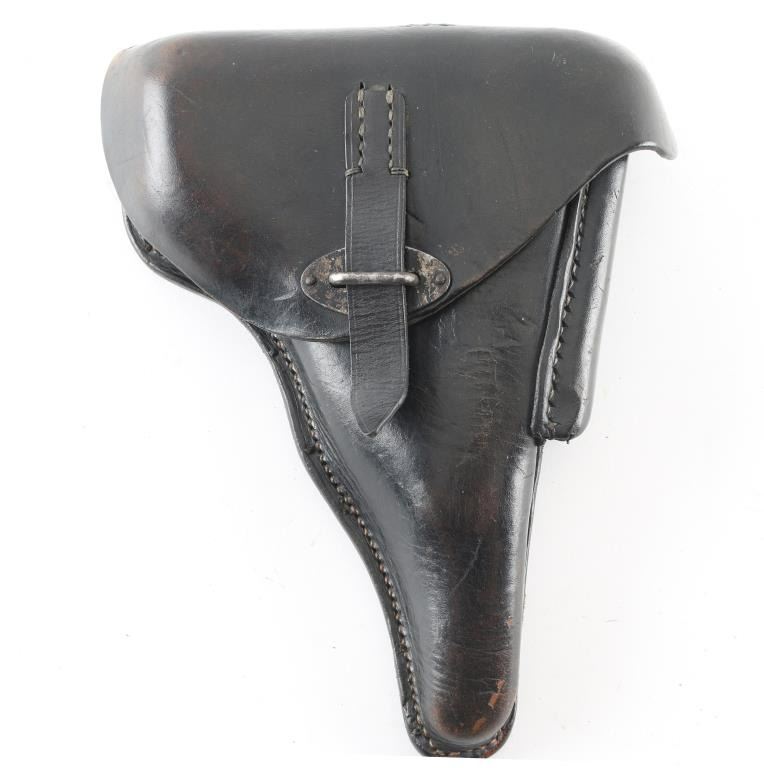 Third Reich era German Military holster for the P-38 Pistol. Hard shell. Black leather construction. Large "P.38" stamped on back, along makers code "eue", dated 1942 and Waffenamt, Eagle/WaW300. Written in ink on the inside flap is the German soldiers name and unit, "Ofw. Peter Sommer, Z.Z./L 53663/D Hien Nr. i3259J". Intact, very good condition.