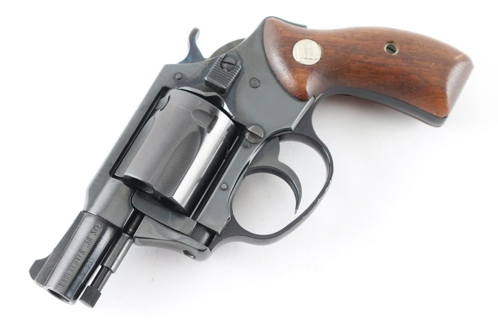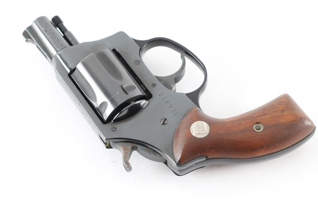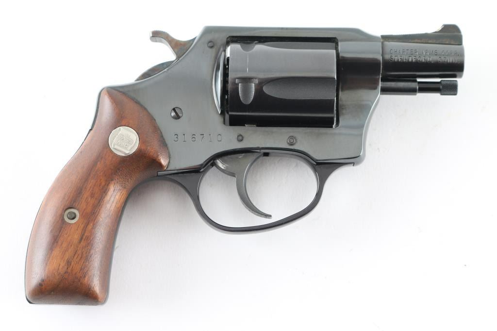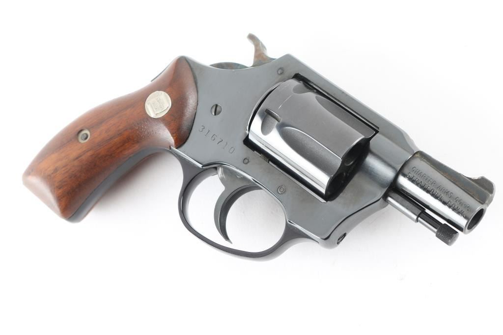 Double/Single action revolver features blued finish, smooth wood grips with silver Charter Arms medallions, 1.75" barrel, fixed, round butt. Bore is excellent. Retains 98% blue with minor scratches/edge wear. Grips are excellent condition. Action operates smoothly with tight lock-up. Come with one speed loader. Condition is NRA Very Good + Modern Firearm