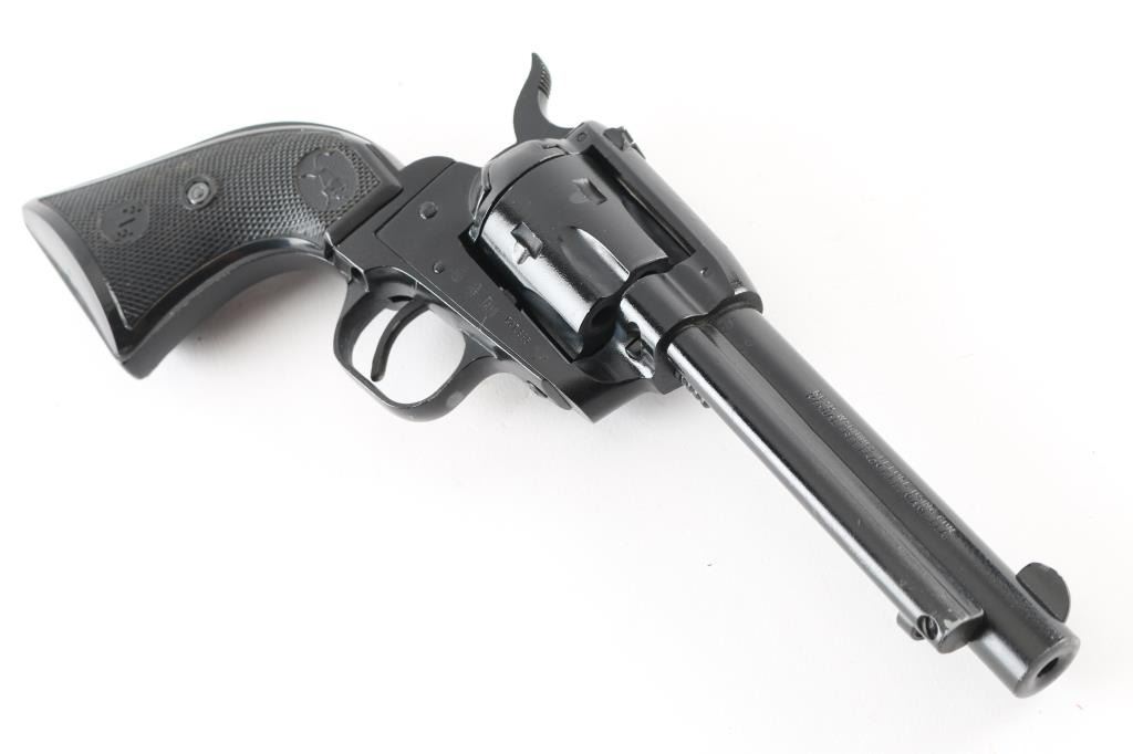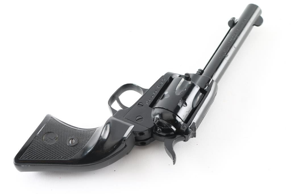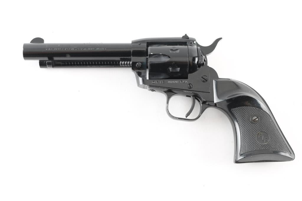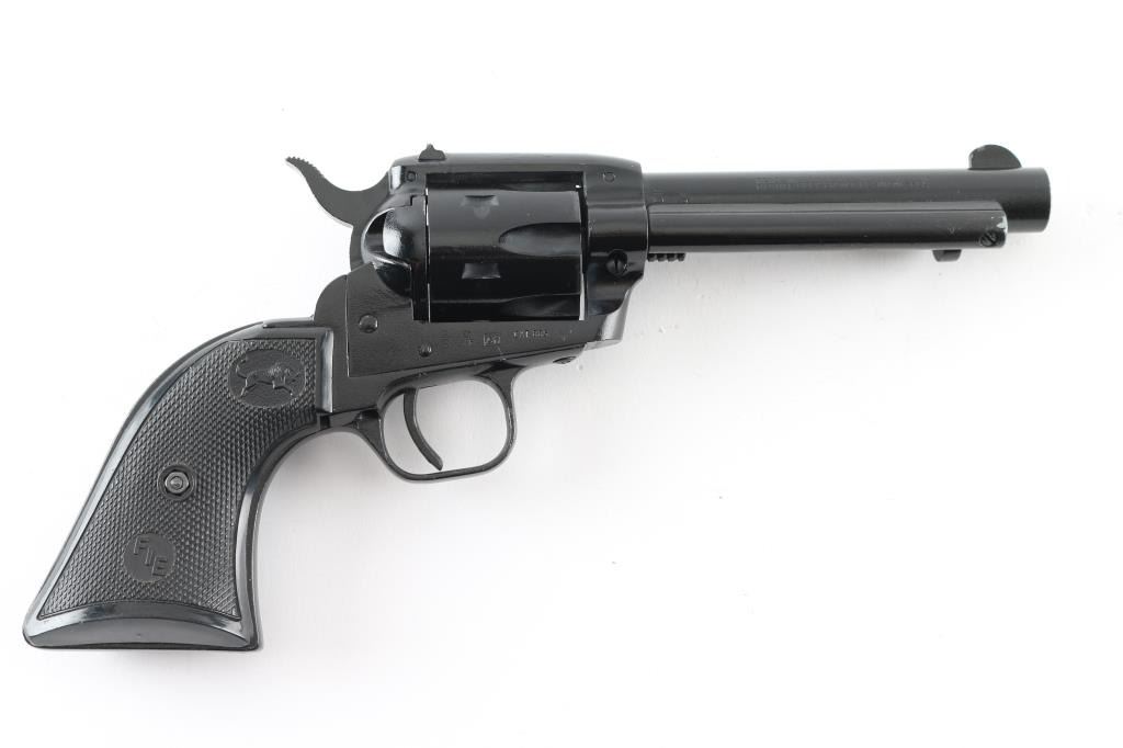 Vintage economical copy of the Colt Frontier Scout single action revolver chambered in .22 Long Rifle. Features a black finish, 4.75" blued barrel, blade front sight, square-notched rear sight, ejector rod, fluted six-shot cylinder, serrated hammer spur, alloy frame, two piece checkered grips and a hammer block thumb safety. At some point in time this gun was painted black with black paint and has flaked off in a couple of spots. Bore looks good, dirty. Grips are fine. Condition is NRA Good+ *Modern Firearm*