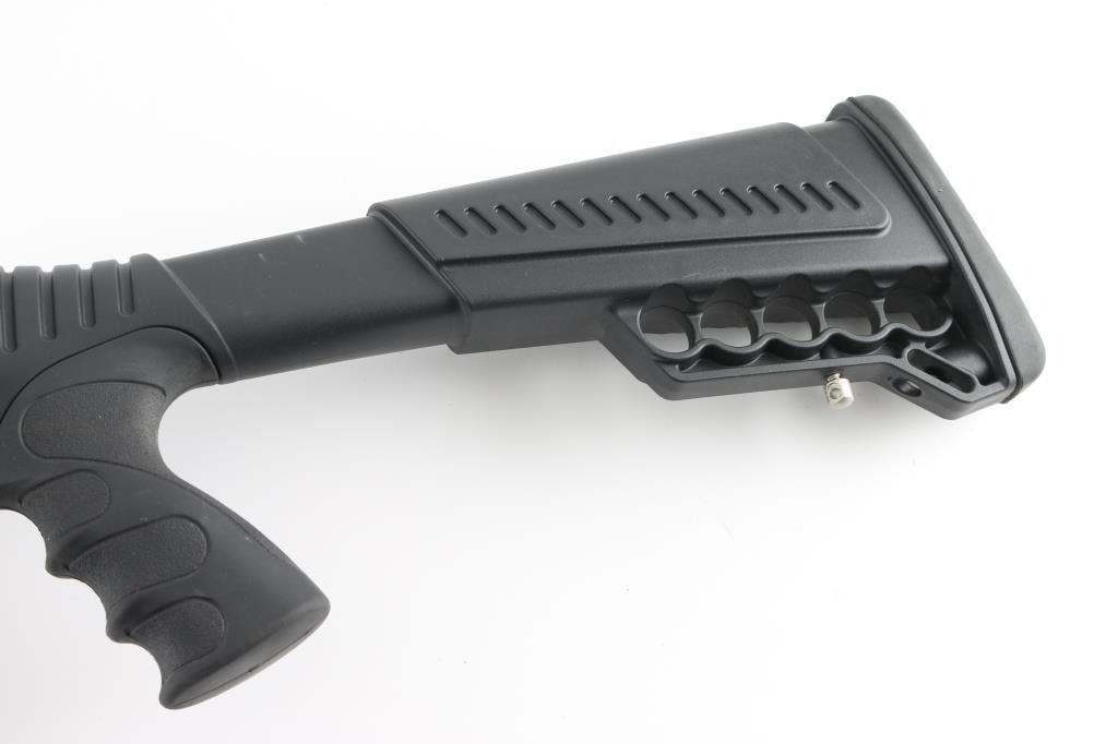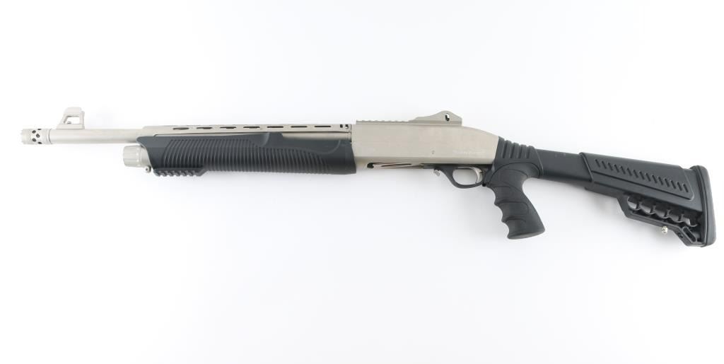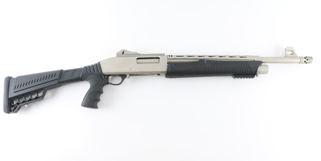 Turkish made pump shotgun imported by Dickinson LLC, Moorpark CA. Features electroless nickel finish, black polymer furniture, ribbed pump handle, pistol grip stock with cartridge holder loops across bottom of shoulder stock, protected fiber optic front & peep rear sights, heat shield over barrel, sling studs, pushbutton manual safety. Magazine tube is traditional short tube extending just forward of the pump handle. Barrel threaded for choke tubes, included tube is a vented muzzle brake "breacher" type with aggressive textured front edge. Shotgun is in excellent condition with minor handling marks, some rubbing wear on mag tube and on receiver where pump handle rubs. Condition is NRA Excellent *** Modern Firearm ***