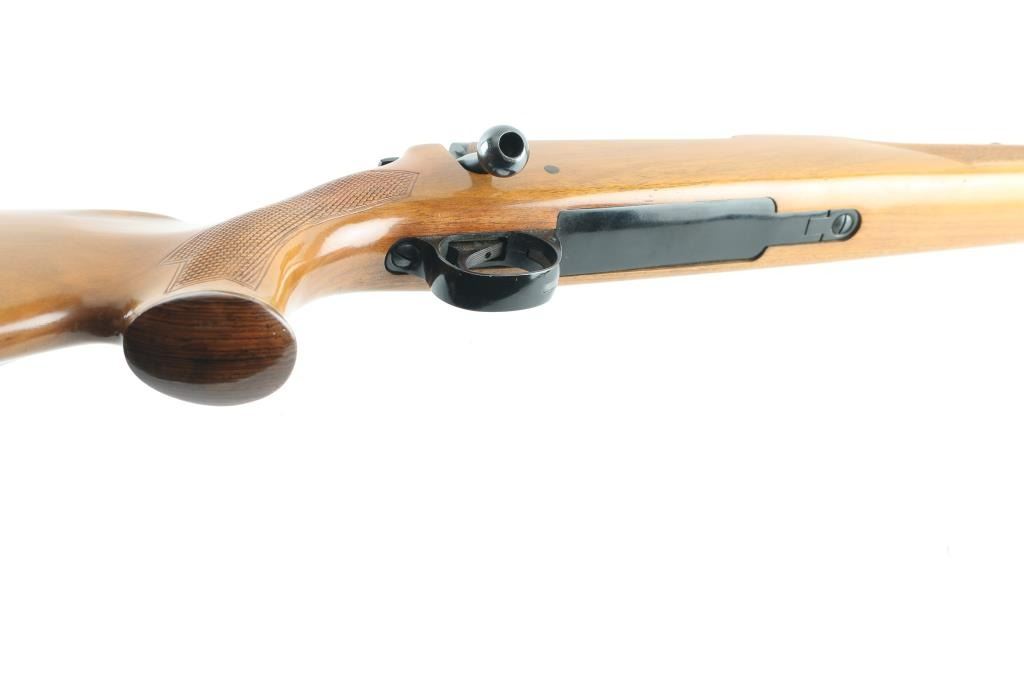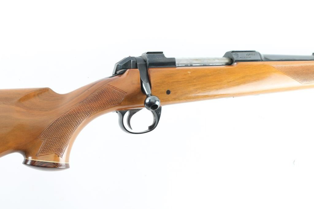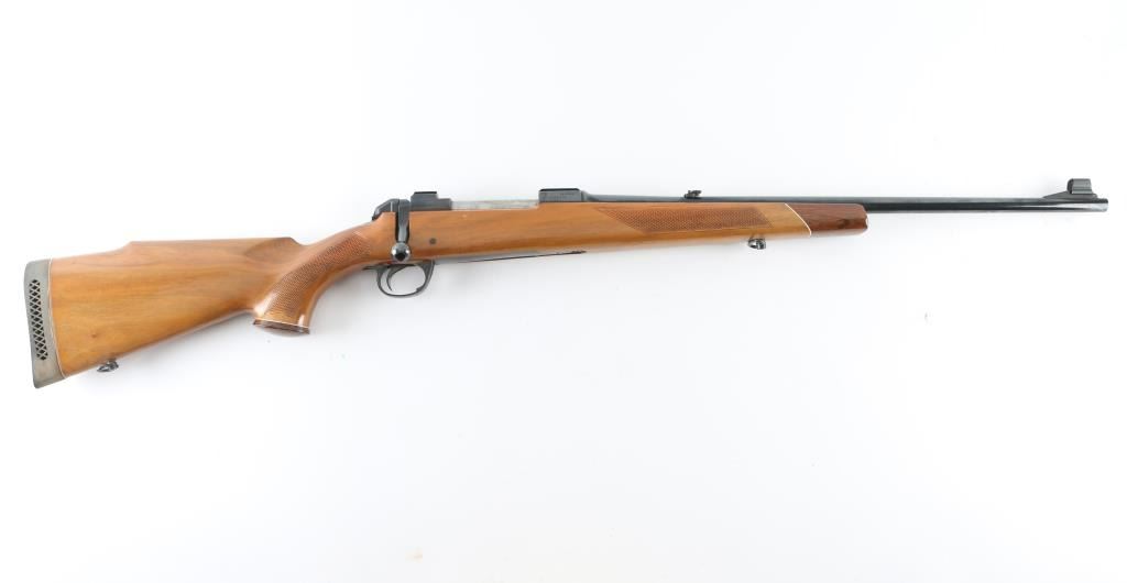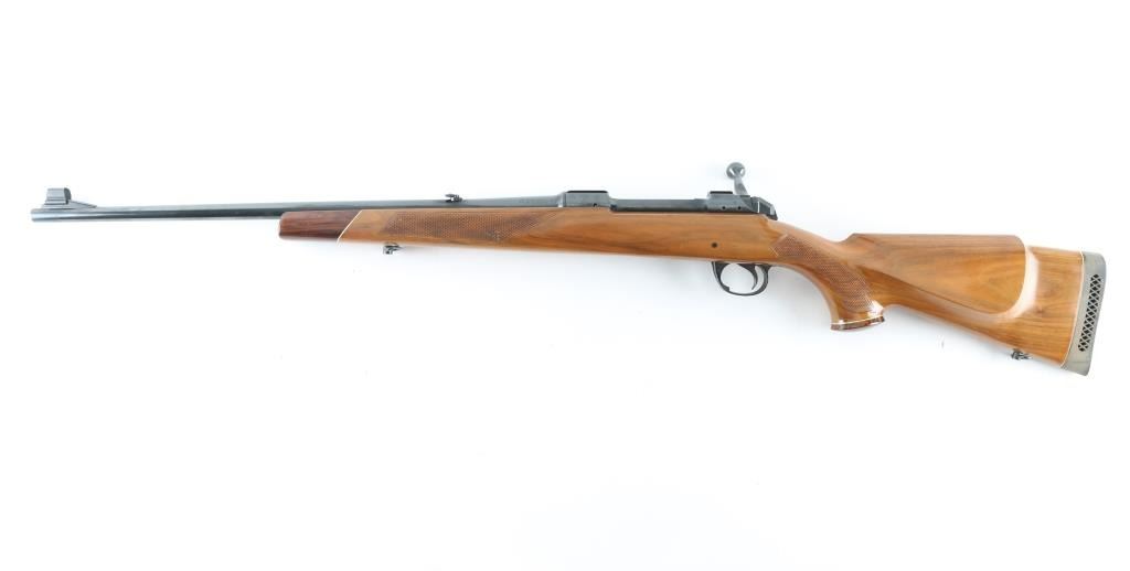British made deluxe sporting rifle. High polished blue bolt-action rifle with a 22" barrel, ramped, hooded. post/bead, and adjustable flip, u-notch rear sights, manual safety, integral scope bases, wood stock, hinged floorplate, adjustable serrated trigger, factory recoil pad, wood stock with checkered forearm, and wrist, contrasting dark walnut forend, and grip cap, sling swivels. Blued finish is about 98% Bore is bright and shiny with sharp rifling. Action is working well. Blonde colored stock has sharp checkering panels, a couple of very minor dings, Polished bolt has 5 gold star engraved on it. NRA Condition-Excellent. Modern Firearm.