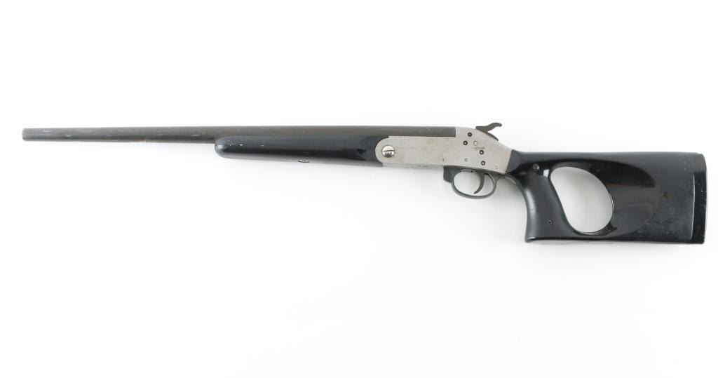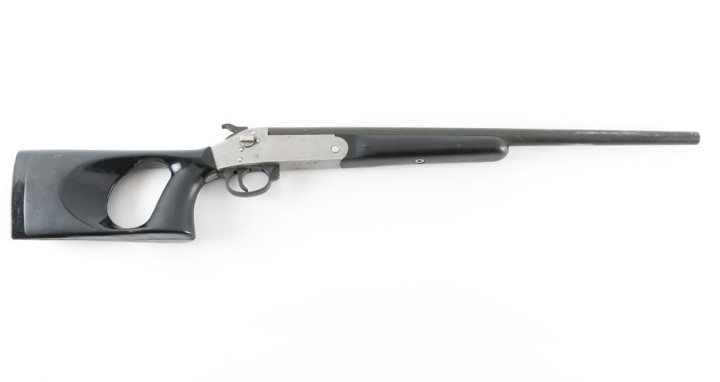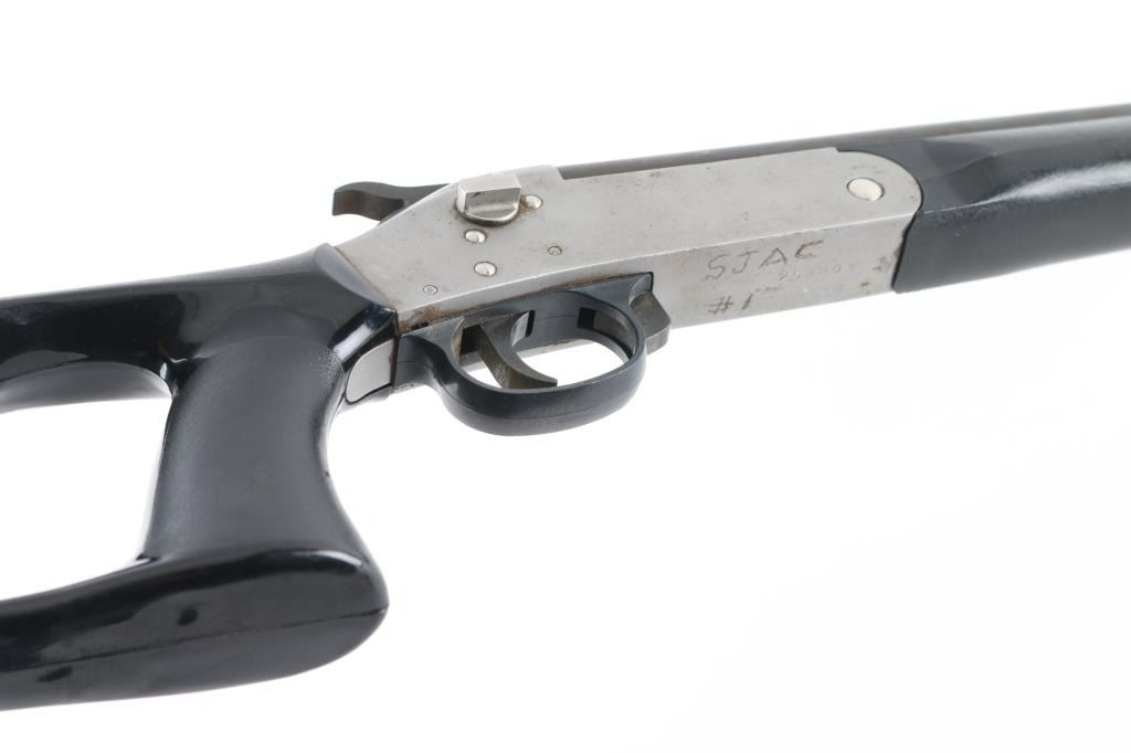 SN: 25820 Single Shot break open shotgun features blued barrel & stainless steel receiver, black polymer furniture (pistol gripped short stock holds 4 shells, sliding cover missing), no bead or other sights, 18" barrel with fixed CYL choke, 28.5" overall length, exposed hammer, rotating safety on right side of receiver, opens with lever in front of triggerguard. Bore is good to very good condition. Metal surfaces are fair to good, showing scuffs and blemishes throughout, barrel has light rust under forend. Polymer furniture is very good condition, missing the sliding cover for the butt trap. Marked on bottom of receiver "SJAC #1" with electric pencil. Condition is NRA Good+ *** Modern Firearm ***