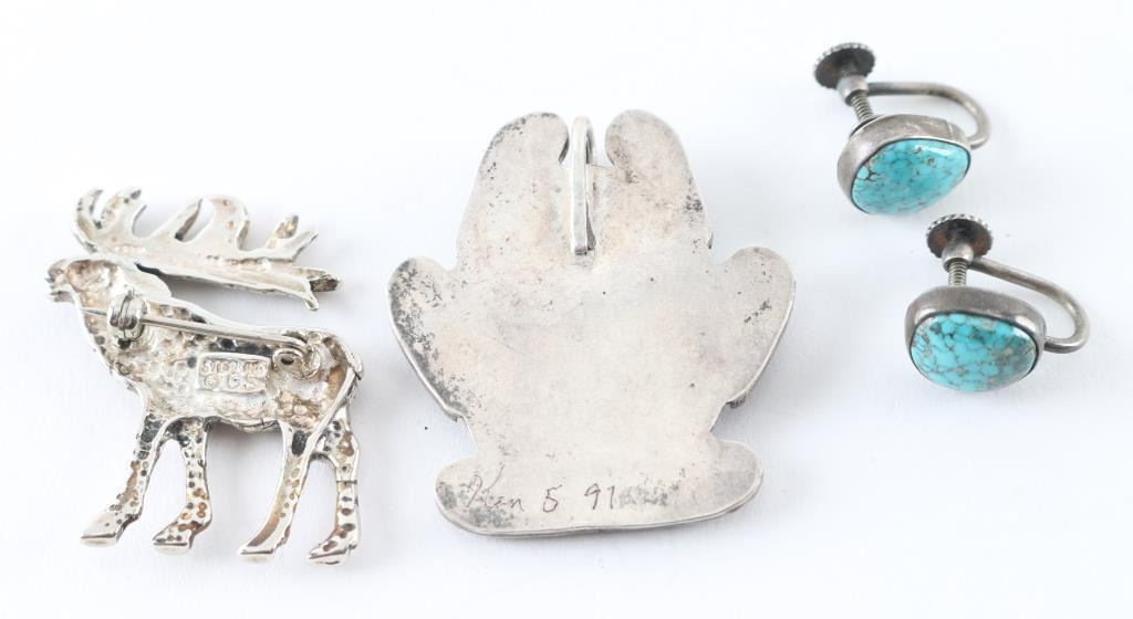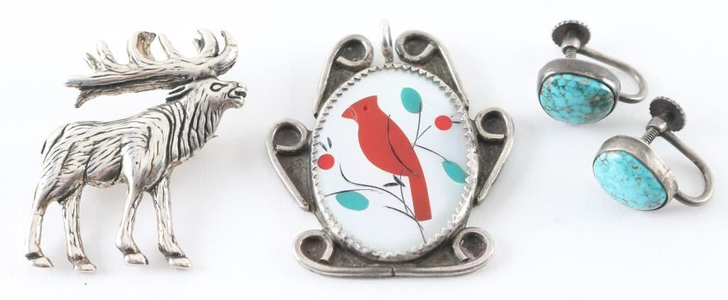 Including a Zuni inlaid pendant with robin motif signed "Ken B", set in sterling sliver, and a sterling sliver Elk pin stamped "GS". Also included is a set of turquoise and sliver earrings