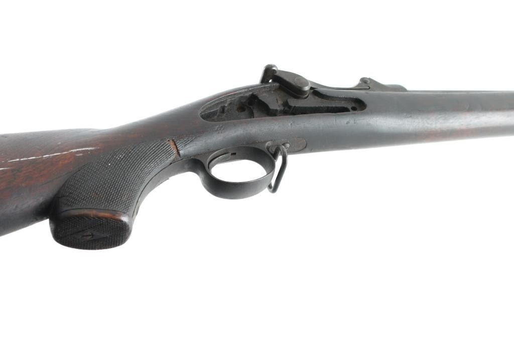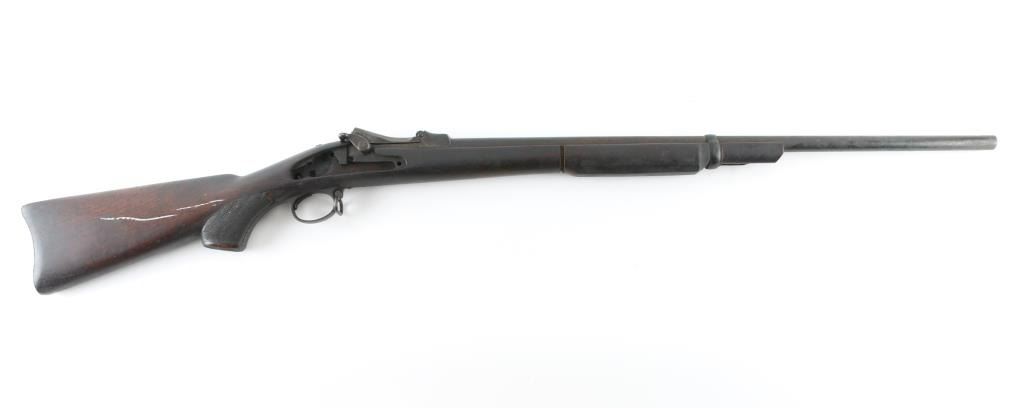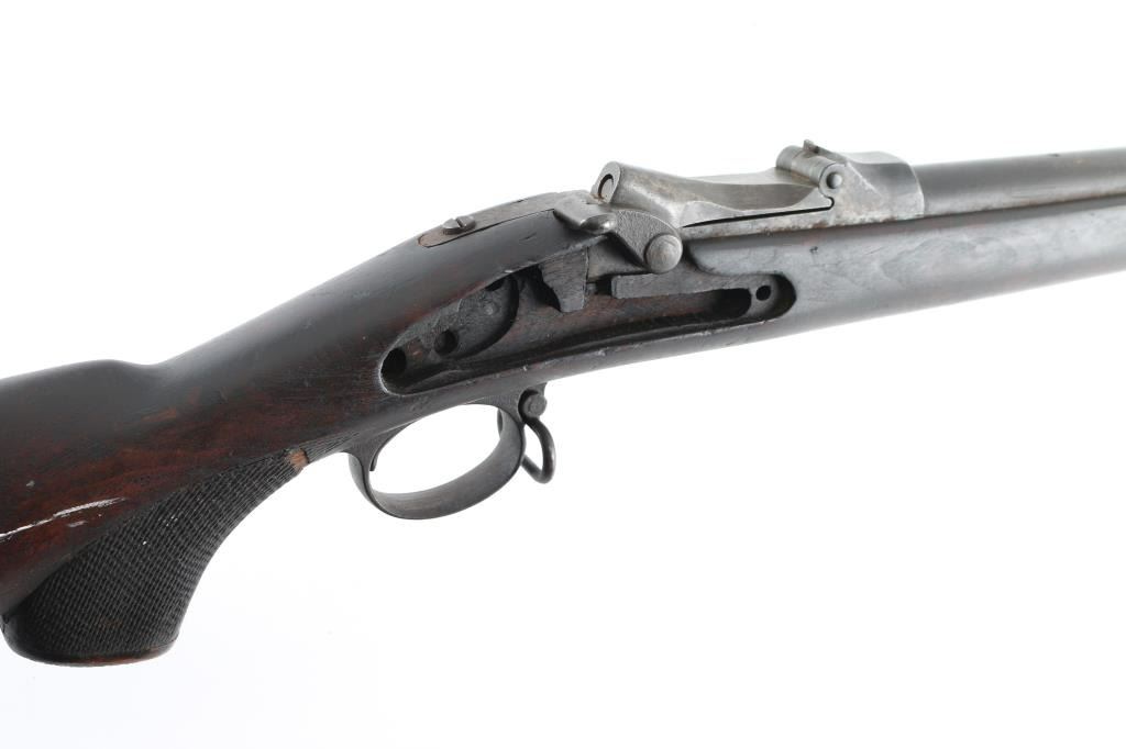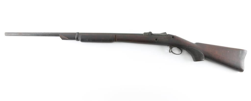 Relic condition US military single shot rifle. Barrel measures 28", with small flat square area behind muzzle where a front sight might be located. 1884 dated breech block appears complete, with firing pin & ejector. No rear sight, single barrel band. Stock has been cut to about half barrel length, with a spliced in (loose, not glued or otherwise fastened) forend that has a thicker cross section. Lock plate missing. Wrist has an added pistol grip (checkered, similar style to Officer's model carbines) that appears to be a later addition. Bore is poor rusted condition. Metal surfaces are uniformly dark brown, scaly with rust & thick patina. Wood is fair condition, dry with many small dings & scrapes, large chip missing from reshaped front of forend. Condition is NRA Poor (missing many parts) *** Antique Firearm ***