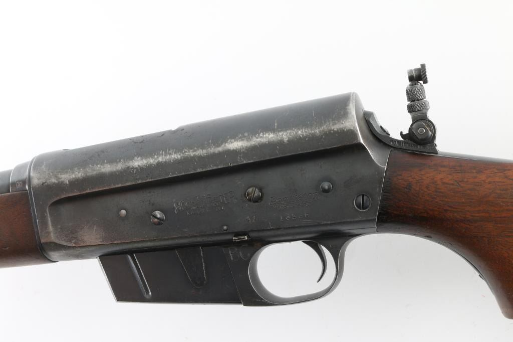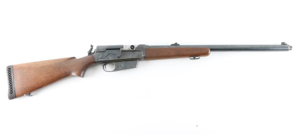 The "Woodsmaster" is a semi-auto rifle chambered for .300 Sav. ammo. It has a blued 22" barrel with raised blade front sight, flip up rear sight and a Marble rear peep sight on the tang. It has a fixed magazine, smooth trigger and manual safety on the right side of the receiver. On the left side of the trigger guard are the initials BC. The two piece smooth, straight grain wood stocks have sling swivels attached and a hard as a rock recoil pad. The metal finish looks okay on the barrel with a few spots that show some use and wear. The receiver is very scuffed up on the left side. Wood stocks look good with a few little dents and dings as is to be expected. Bore looks great just dusty. LOP is 15". Condition is NRA Good *C&R Firearm*