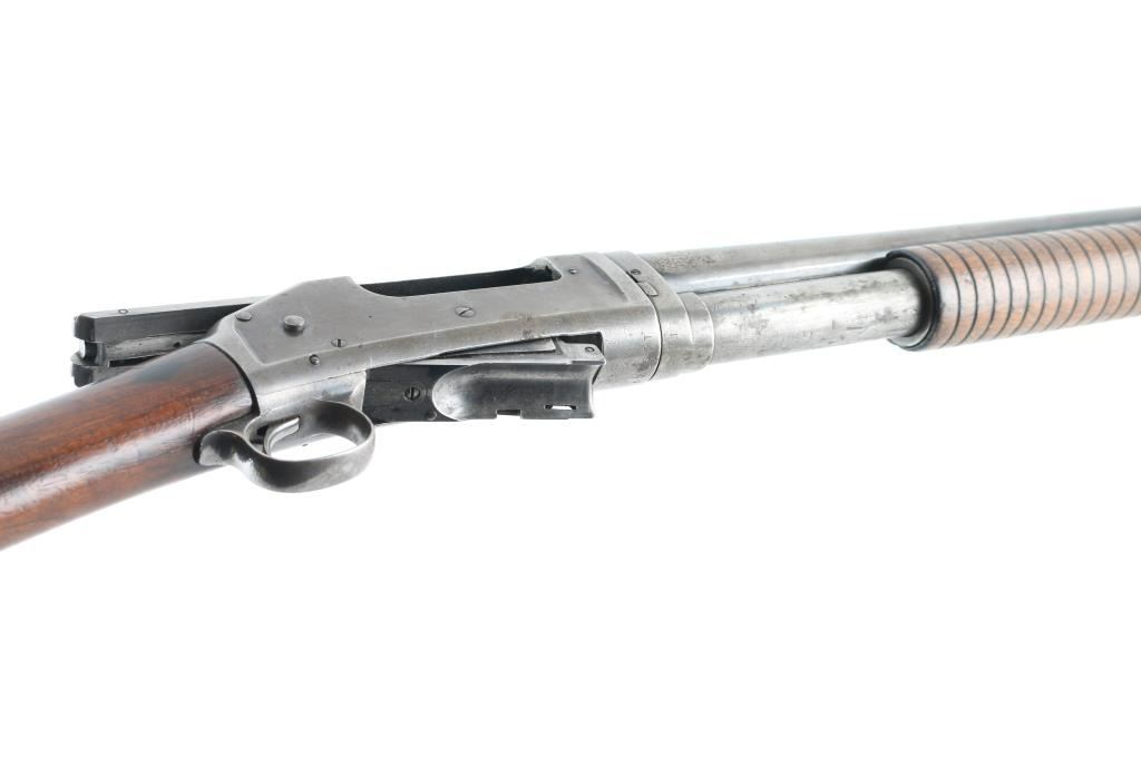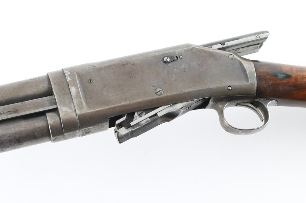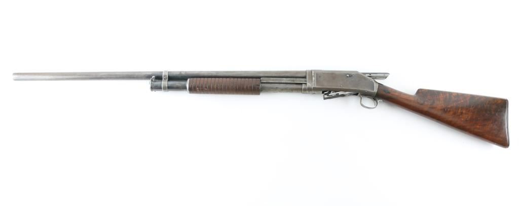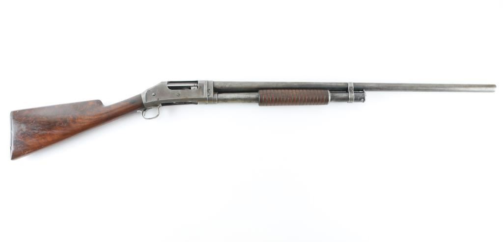 Vintage slide-action repeating shotgun chambered for 2-3/4" 12 gauge shells, manufactured in New Haven, CT circa 1901. Features full choked 30" take-down barrel, 5 round tube magazine, brass bead front sight, smooth trigger, exposed hammer with knurled spur, steel receiver, grooved walnut slide handle and smooth fancy figured walnut semi-pistol grip shoulder stock with factory butt plate. Bore is good condition. Metal surfaces show a brownish color bare metal, light patina and small areas of pitting throughout, some rough texture. Wood is good condition, dented and gouged, crack in pump handle. Chipped buttplate. Markings are thin. Has mechanical issues, non functional in current state, needs gunsmith attention. Condition is NRA Poor - mechanical issues *** C&R Firearm ***