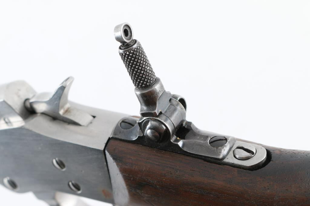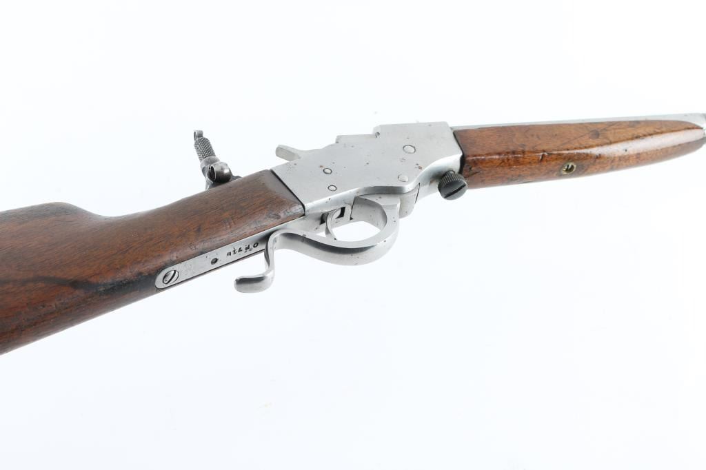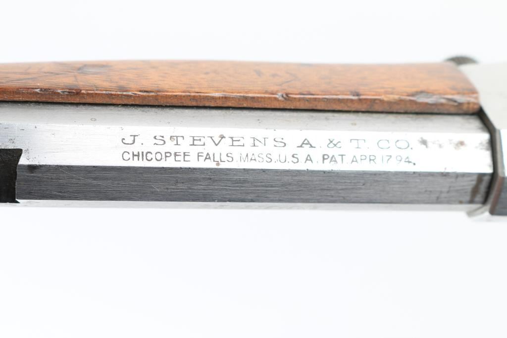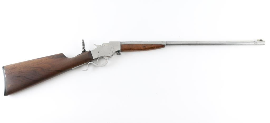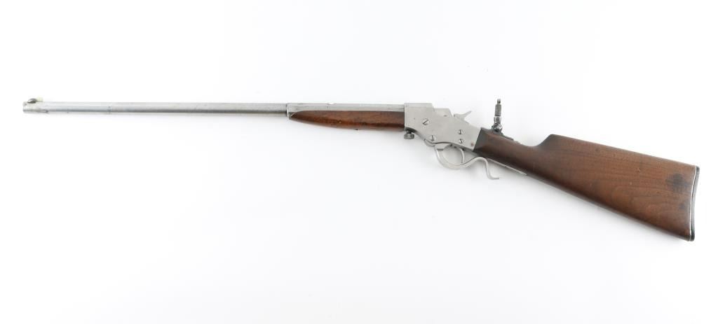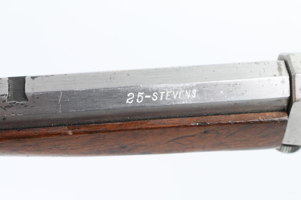 Vintage falling block rimfire rifle chambered for .25 Stevens RF. It features a 21.5" octagon/round barrel, dovetailed blade front sight, factory rear sight removed, adjustable peep sight on the tang, S shape lever, smooth trigger and a serrated hammer spur. It's furniture is a wood "splinter" forend and a smooth wood stock with a black Stevens butt plate over a metal spacer, not the original setup. Metal is 100% in the white there is no finish at all but some surface rust in different areas. Wood forend has a tiny chip missing just in front of the take down screw on the receiver and the stock is fine. Bore looks okay, needs cleaned. LOP is 13". Condition is NRA Fair *C&R Firearm*