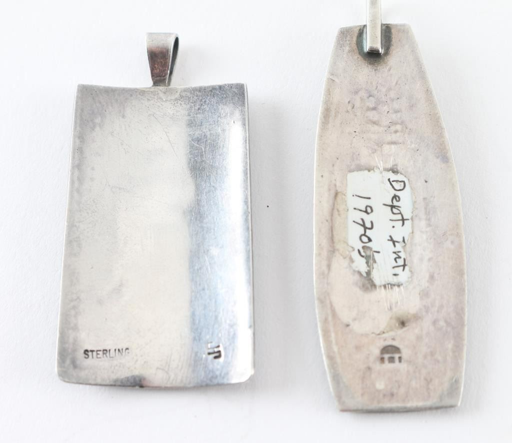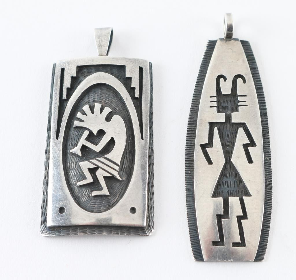 One sterling Kokopeli pendant stamped "JP" and one Kachina dancer, with Department of Interior sticker on back.