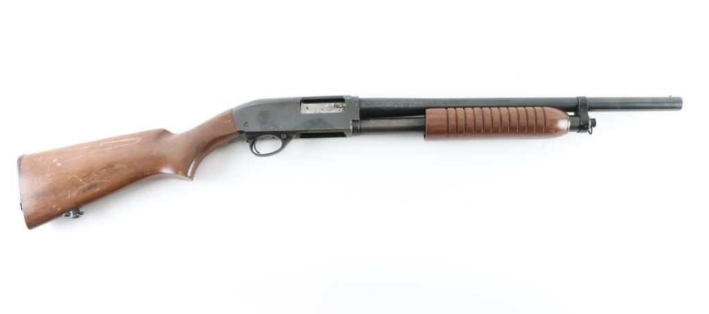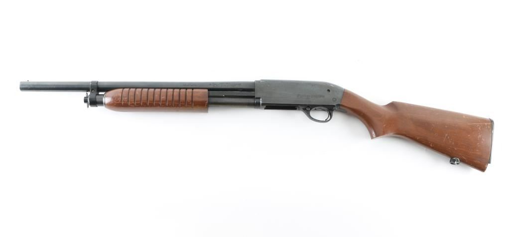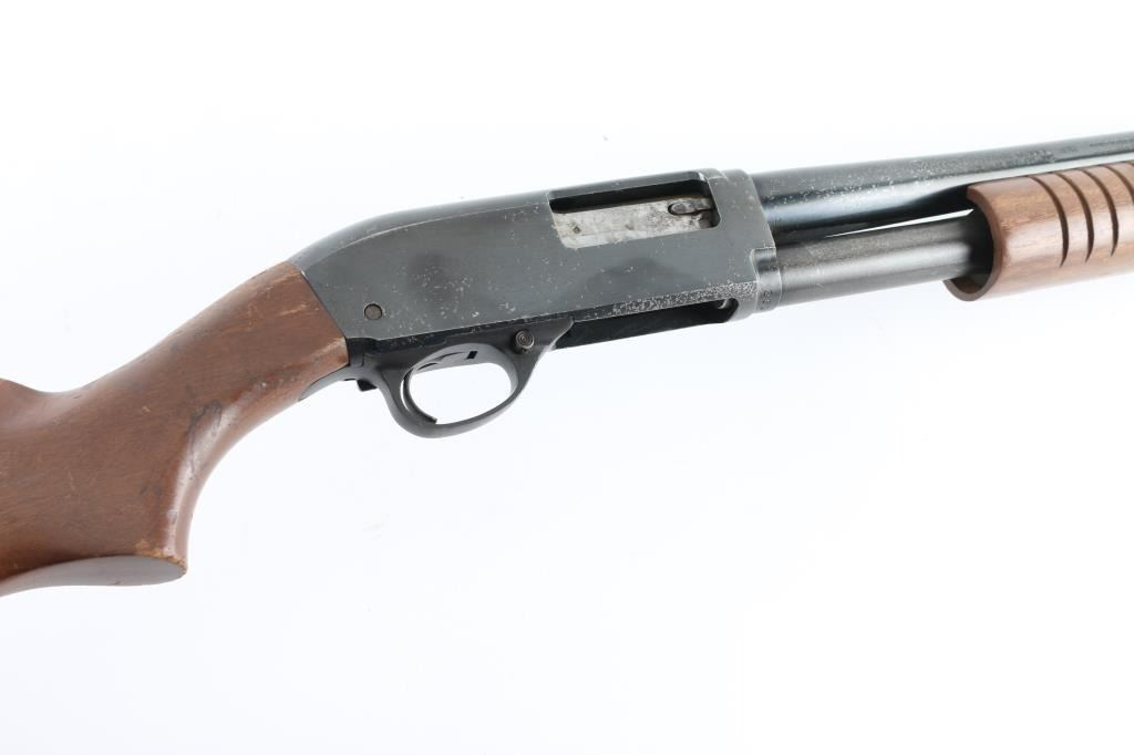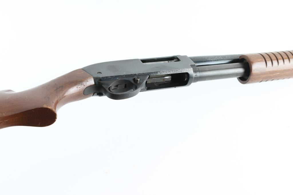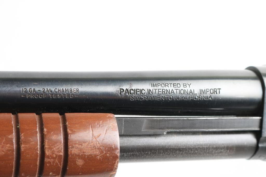 Made in the Philippines this is a pump action shotgun chambered for 2.75" 12 gauge shells. It has a 20" blued barrel and receiver with a 3/4 length tube magazine, brass bead front sight, smooth trigger, metal trigger guard, safety in front of trigger guard and sling swivel attached to magazine cap. Semi-beaver tail "corn cob" style forearm, pistol grip stock with sling swivel attached and a black plastic factory butt plate. Butt plate is broken and missing below the bottom screw. Metal finish looks bad on the right side of the barrel toward the breach and the receiver looks bad on the right side as well. It looks like there was a lot of surface rust at one time and was cleaned off leaving bare metal spots. The jeweled bolt and carrier also show wear and some rust. The wood stocks show use and wear with some scuffs and scratches. The bore is filthy and needs cleaned bad. LOP is 14.5". Choke not marked on barrel but measures Improved Cylinder with a choke gauge. Condition is NRA Fair *Modern Firearm*