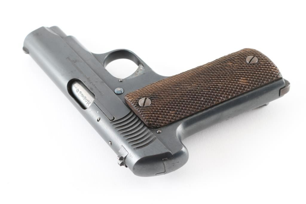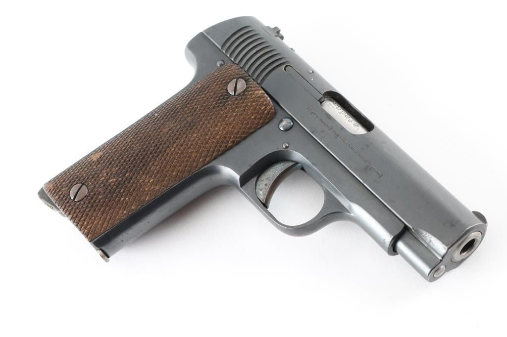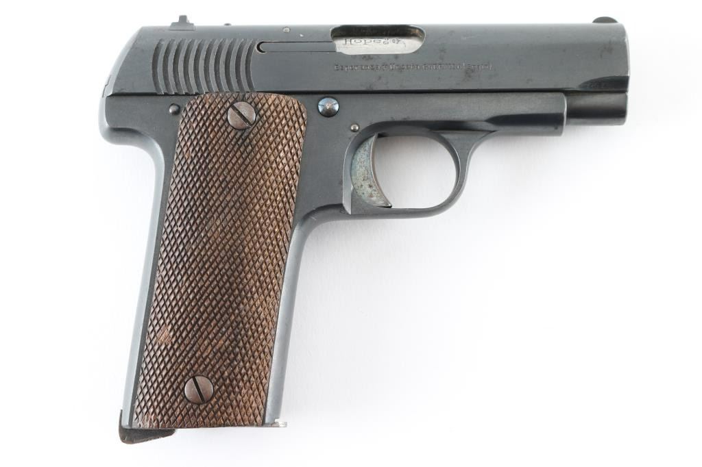 Spanish made Ruby pattern semi-automatic pistol chambered in 7.65mm, manufactured circa WW1. Features a blued finish, 3.5" barrel marked "Hope", "PG" under crown, low-profile round blade front sight, dovetailed rear sight, smooth trigger, concealed hammer, manual safety, heel magazine release, 9 round magazine, steel frame , two-piece fully checkered wood stocks. Although Frame is not marked "EU" and there are no stars on the heel, (Many did not) this pistol has the the following French Army features, Lanyard stable. 7.65 caliber, safety marked "FEU" (Fire), and "Sur" (safe), checkered walnut grips, and "EU" in circle marked magazine. Pistol exhibits approximately 90% of it's original finish showing edge wear and scattered handling marks. nitre blue traces on trigger, Bore appears excellent/bright. Action is smooth, and the wood grips are very good. NRA Condition-Near very good as C&R firearm.