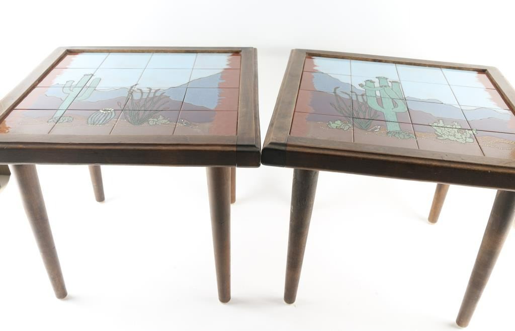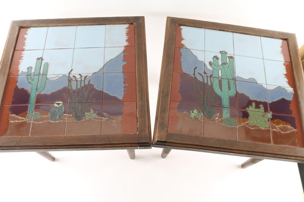 Inlaid tile tops with cactus theme, made from dark stained wood, measuring 18x16", one leg needs repair for adjustment of uneven stance.