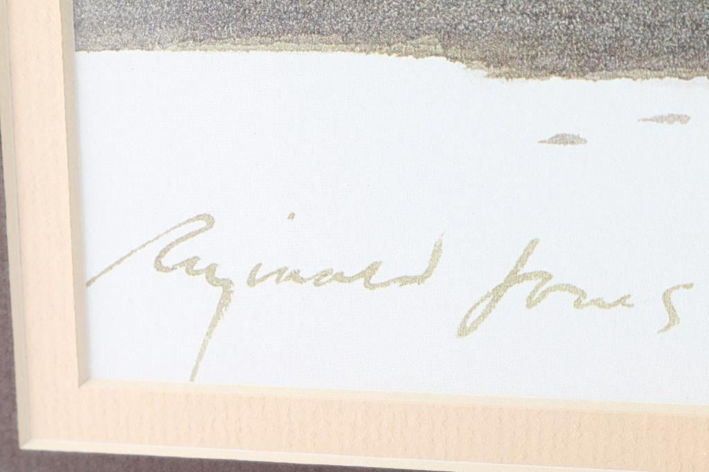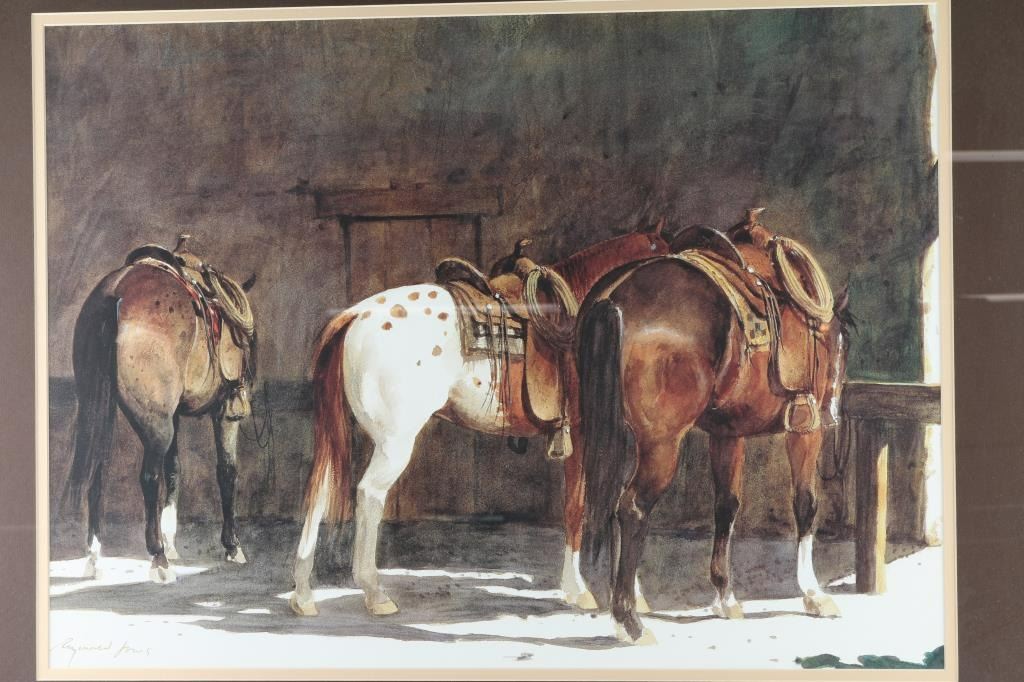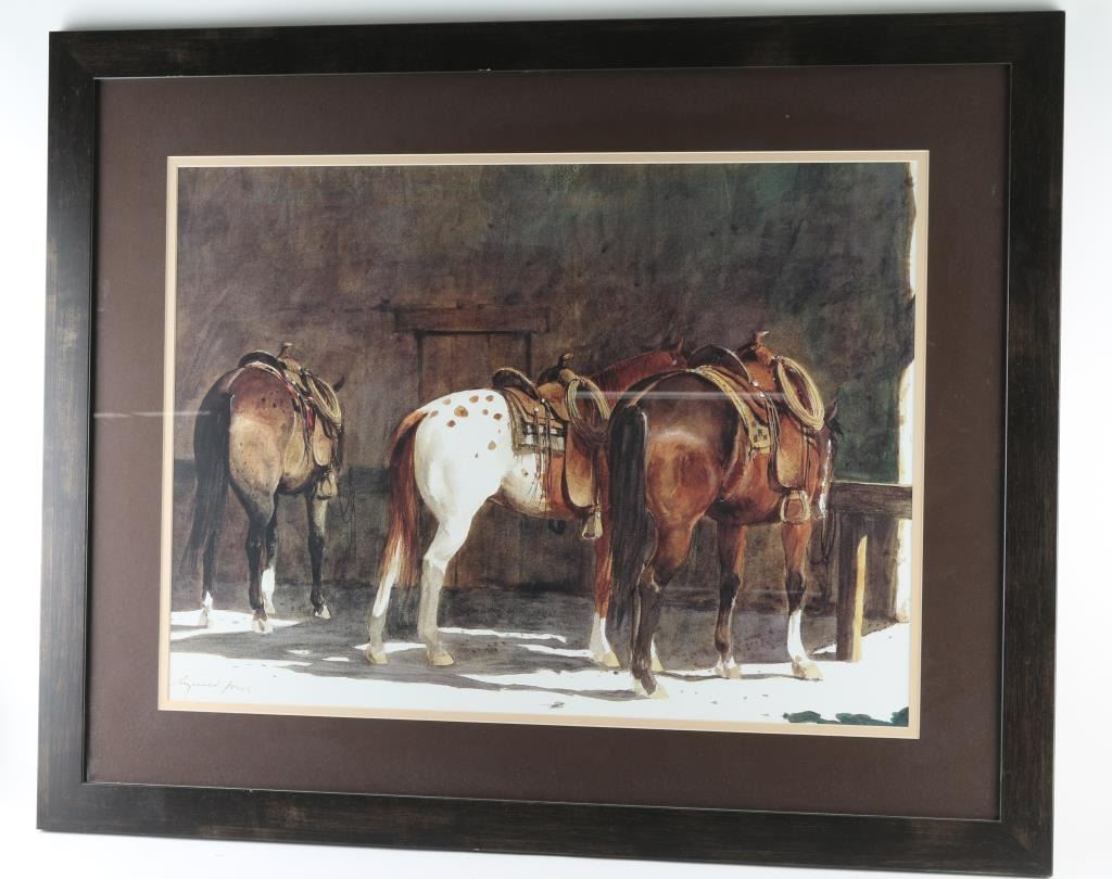 By Raymond James, depicting saddled horses at hitching post, in framed and double matted frame, measuring 28x22
