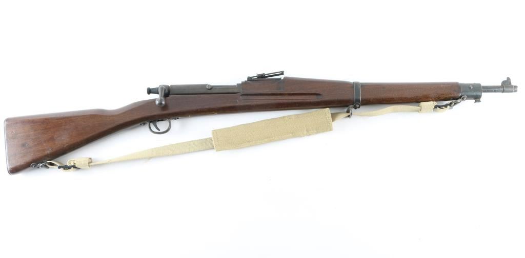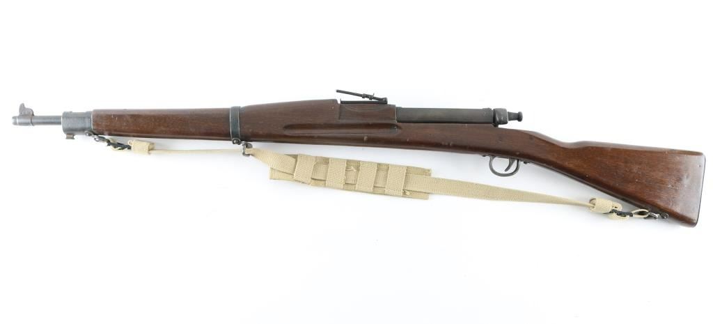 WWII era U.S. military training rifle resembling the U.S. Model 1903 Rifle. Features metal and wood construction with sights, a spring to simulate cartridge resistance and a single action noisemaking hammer. The buttplate is marked "DUMMY TRAINING RIFLE/MARK 1 - U.S.N./ PARRIS - DUNN CORP./CLARINDA, IOWA". Overall condition is very good.