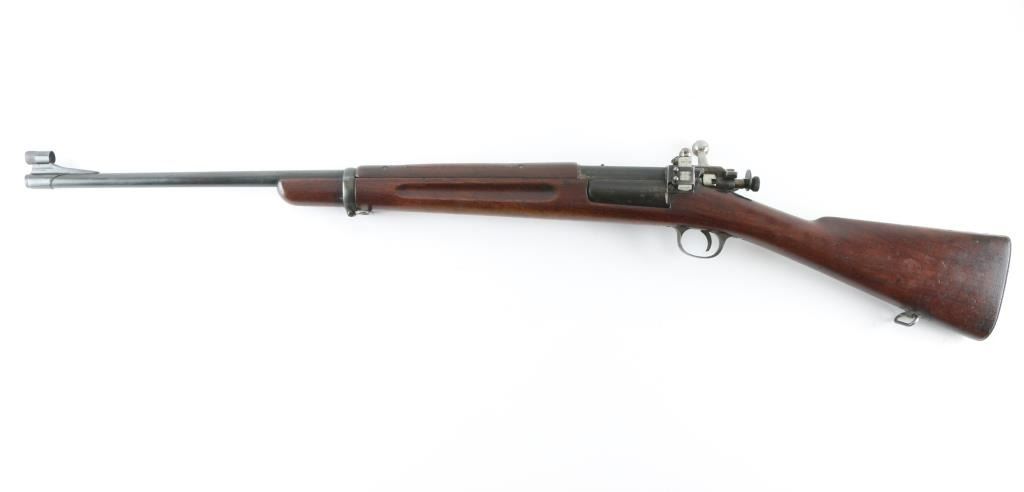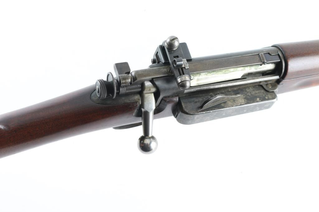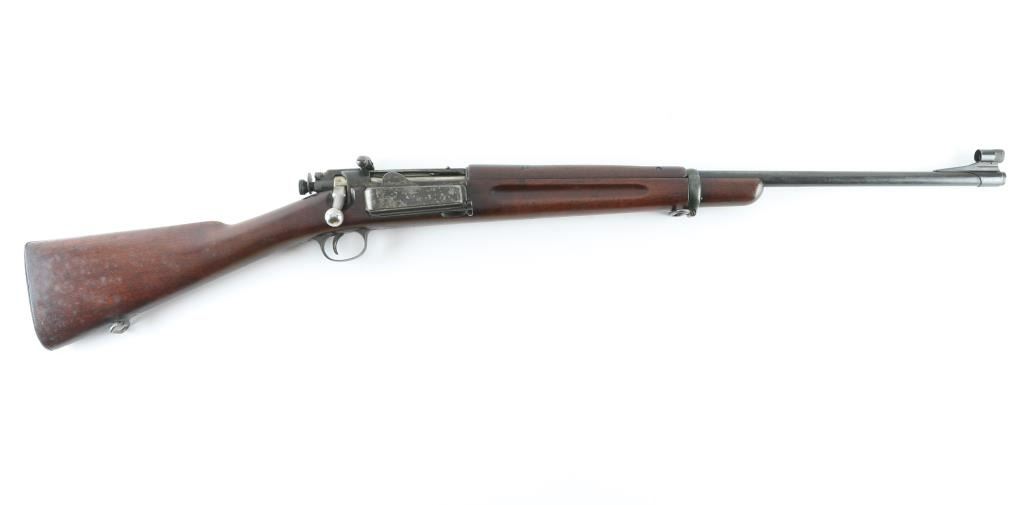 Sporterized U.S. military infantry rifle. Manufactured 1898. Barrel has been shortened to 24", a Redfield ramped globe sight added, with a Redfield adjustable peep sight has been mounted to the left receiver. A piece of wood has been inletted into the handguard where the rear sight was. Action is crisp/tight. Bore is very good, needs cleaning, wood is very good. Blue is about 50% with handling/edge wear, finish loss to the side mounted magazine. Military markings present, left wrist has a 1898 dated cartouche. Great deer Rifle. NRA Condition-Fine as Antique Firearm.