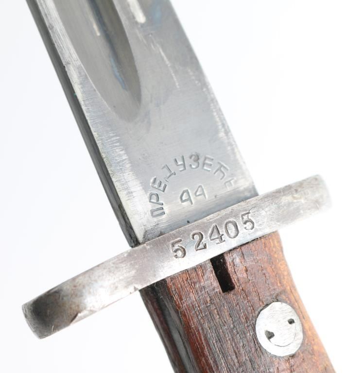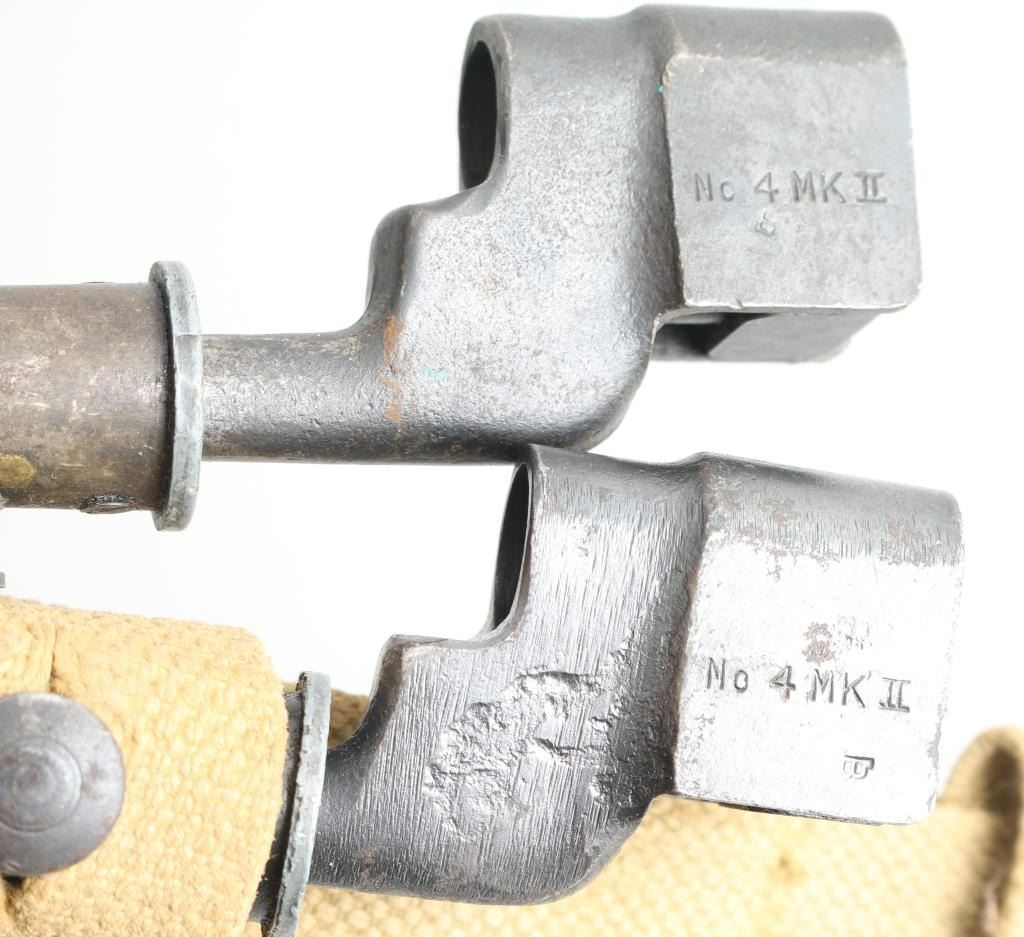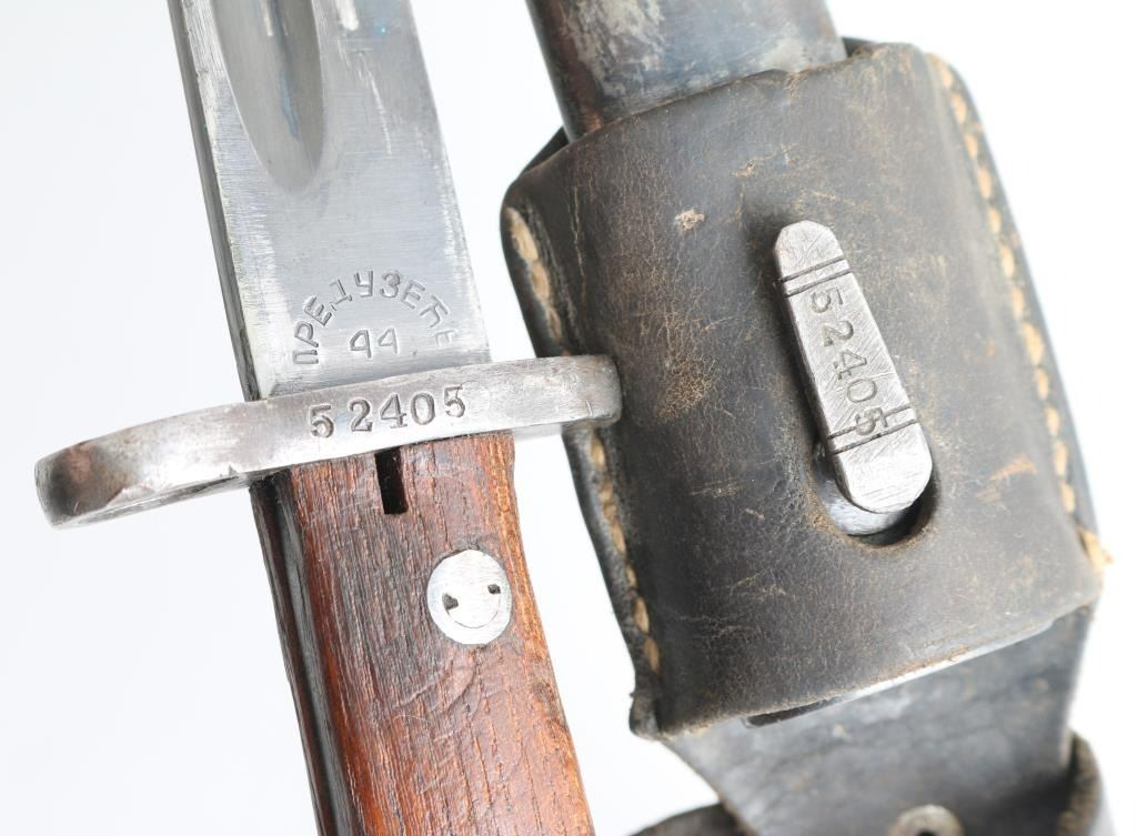 Three total. 1) Yugoslavian Mauser bayonet. Ricasso marked NPEAY3EHE 44". Steel scabbard serial matched to the guard, Correct leather frog. 2) British No. 4 Mk II spike bayonet with scabbard and tan canvass frog. 3) Same as above without frog. Overall good condition.